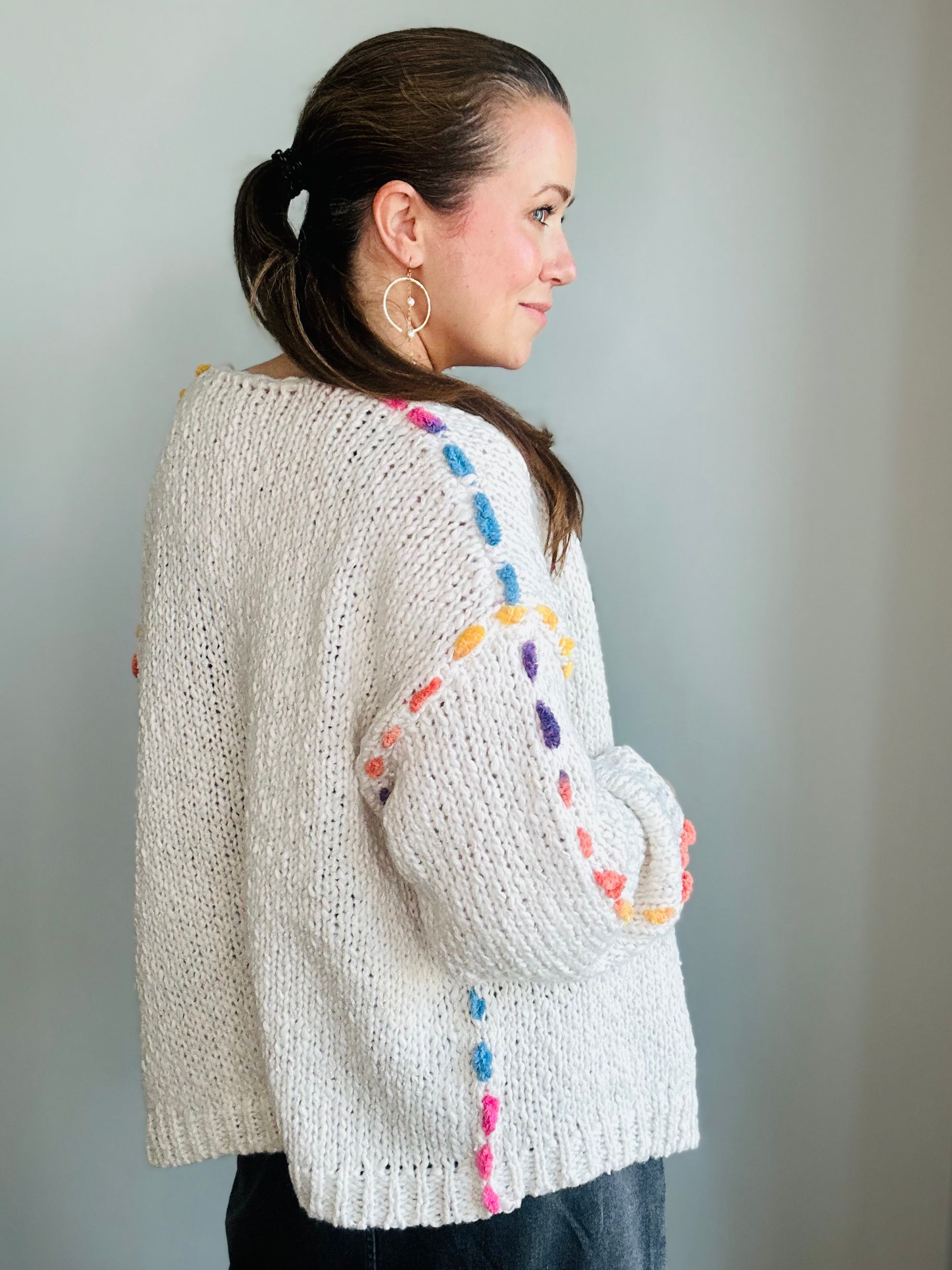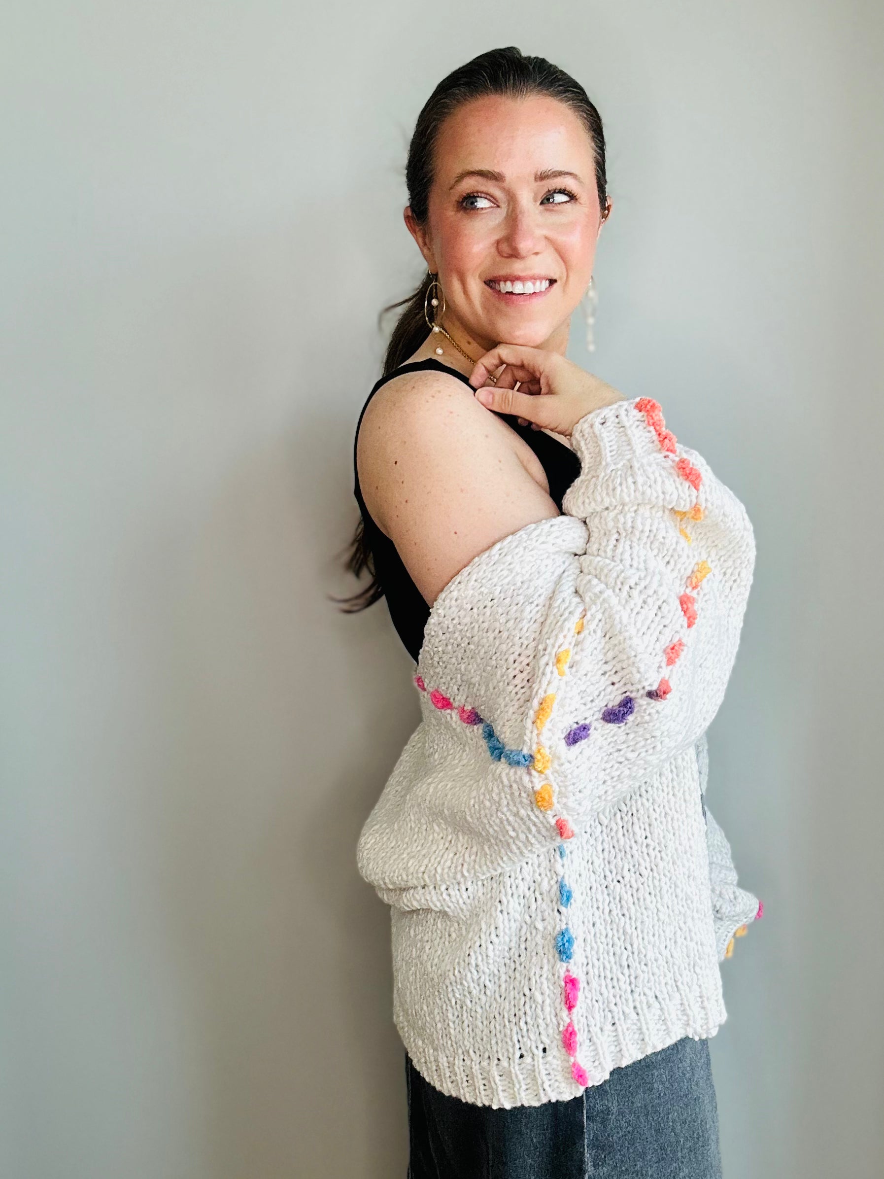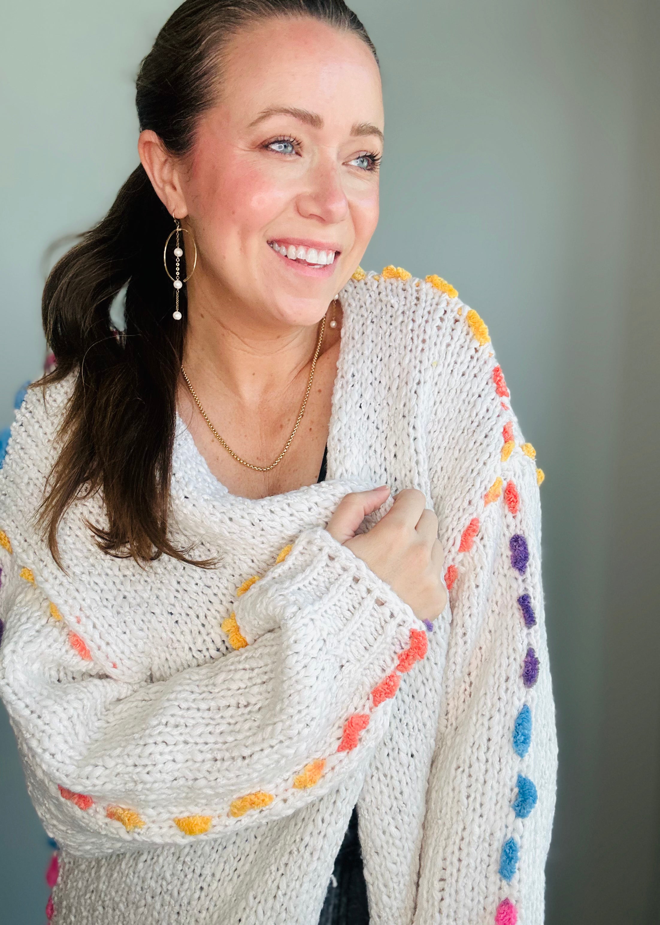 Bring playful charm to your layering collection with this chunky knit cardigan featuring a soft cream base and rainbow-colored yarn running through the sleeves. Designed with an oversized, relaxed fit, this cozy sweater adds both warmth and personality to any outfit.