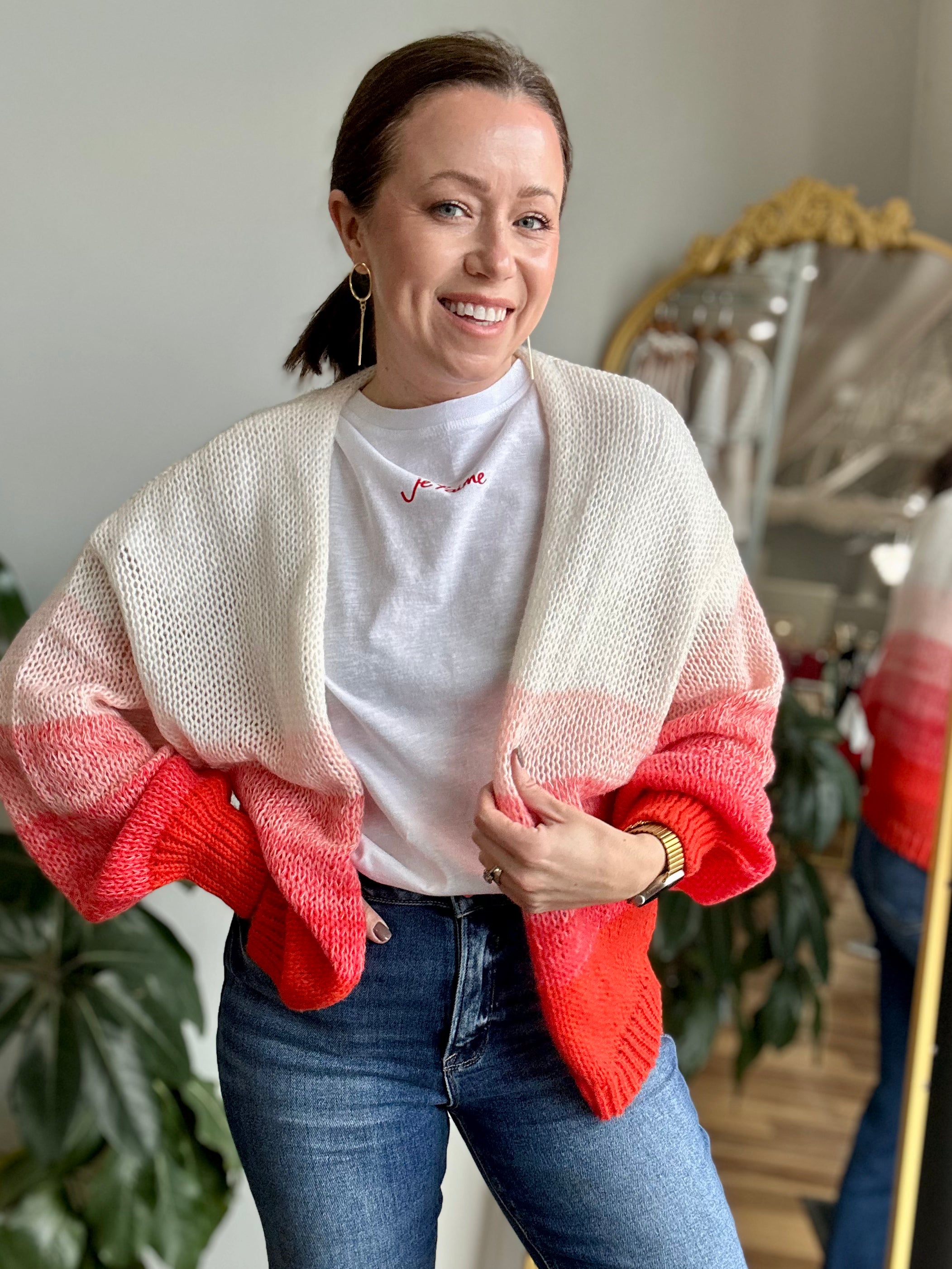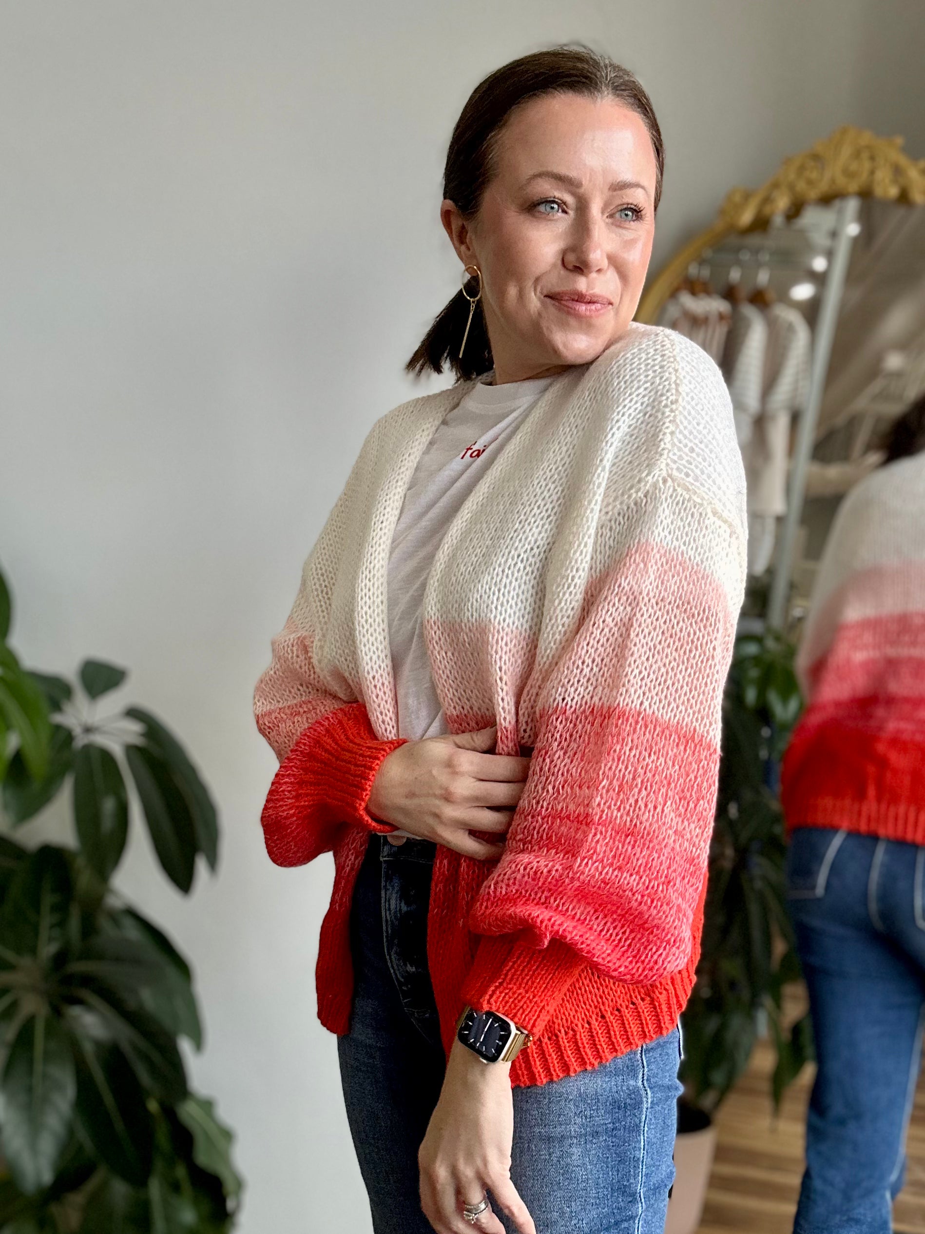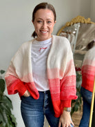 Soft, cozy, and effortlessly eye-catching. The Ombre Knit Cardigan Sweater features a beautiful gradient blend that fades from creamy neutral tones into warm coral hues, creating a statement piece that still feels wearable and timeless. Designed with an open-front silhouette and relaxed shape, this sweater is perfect for layering over tees, tanks, or lightweight knits.