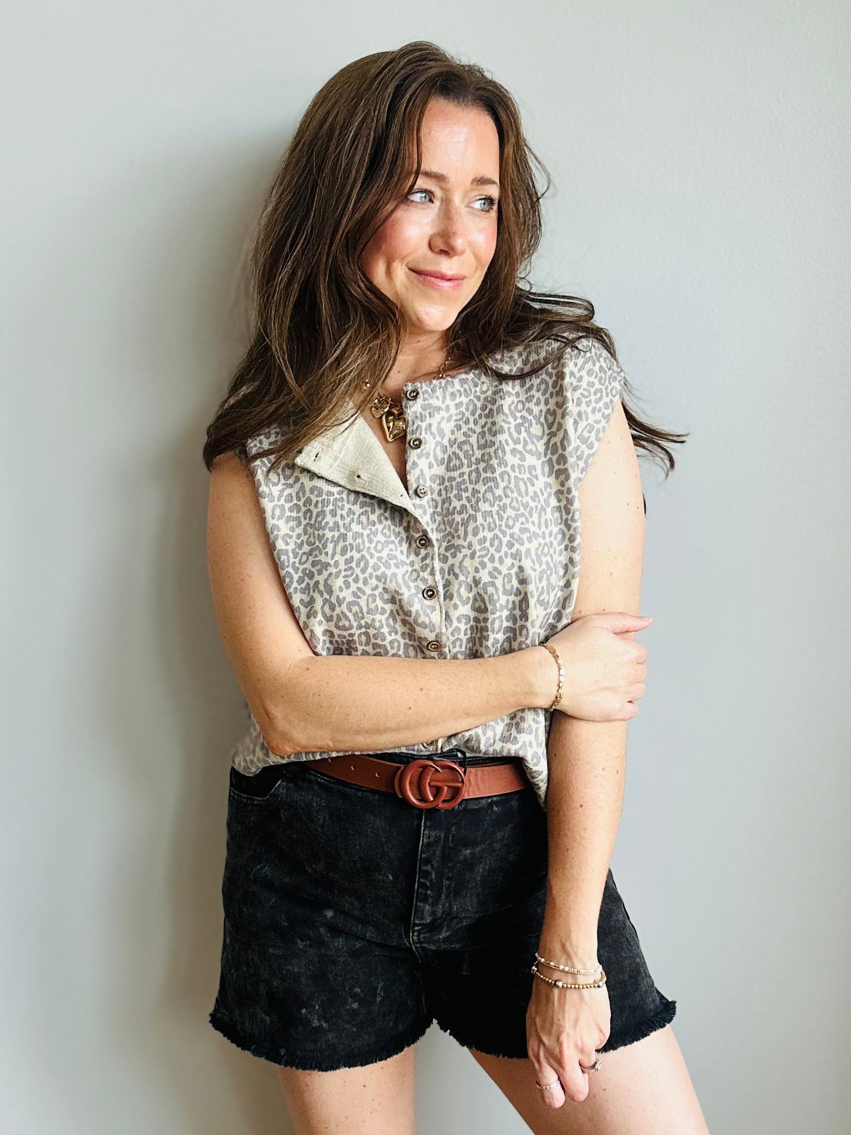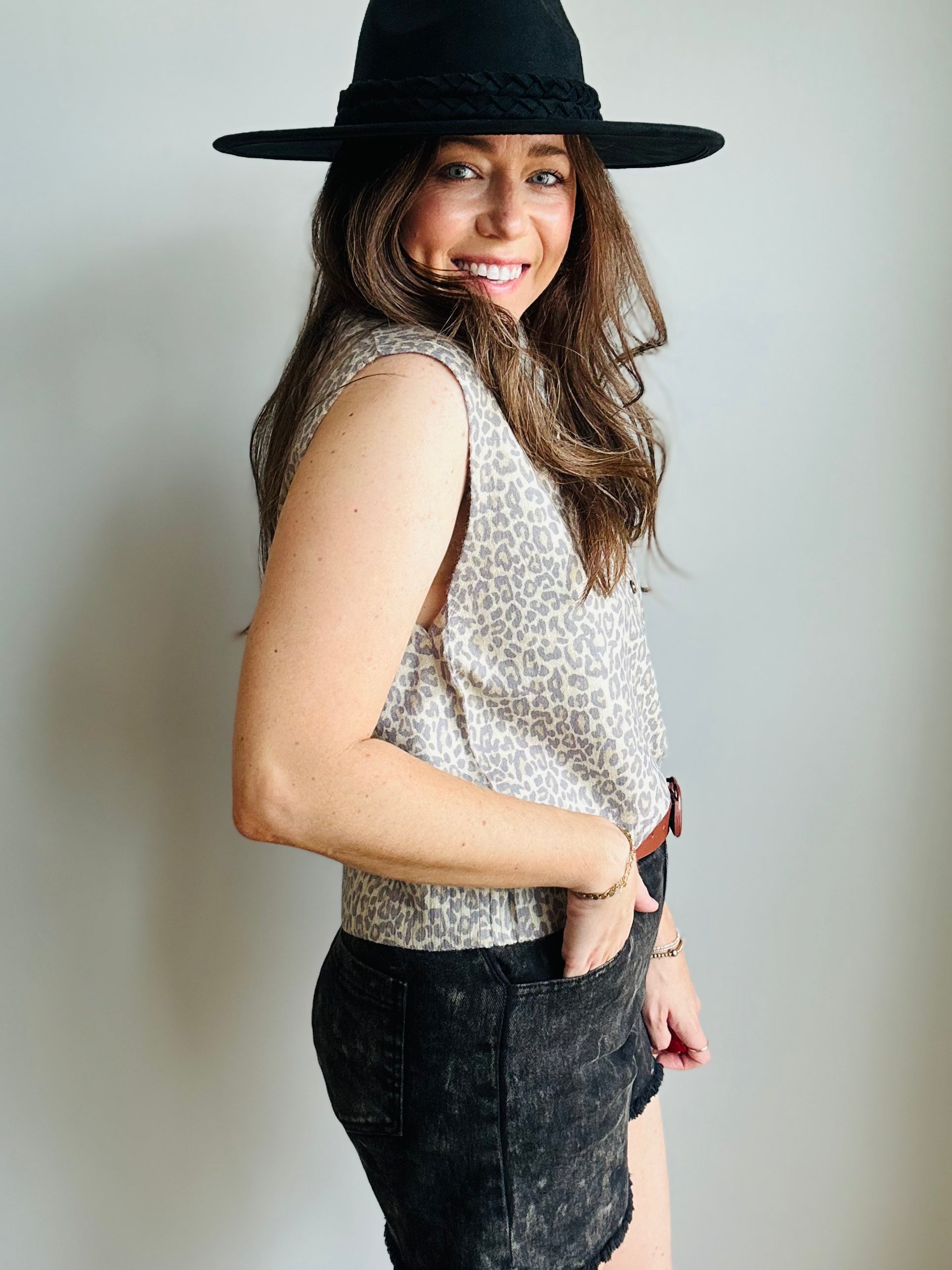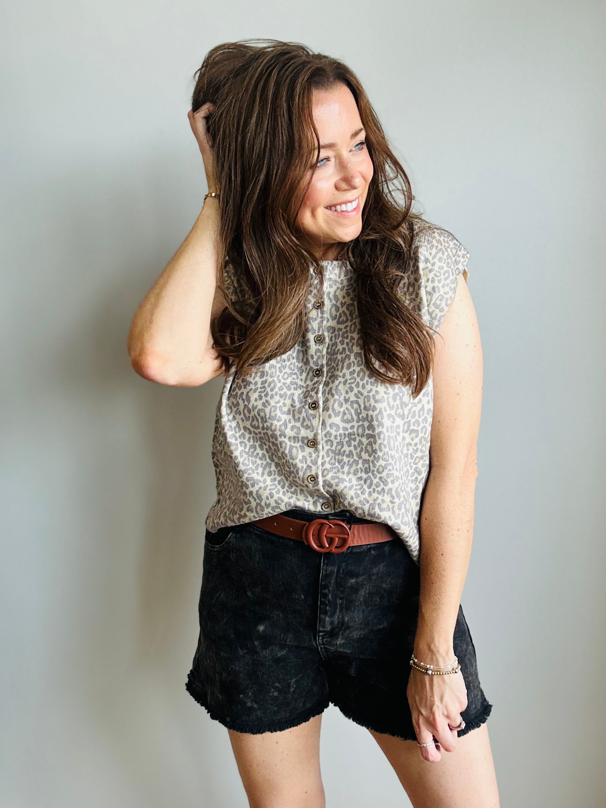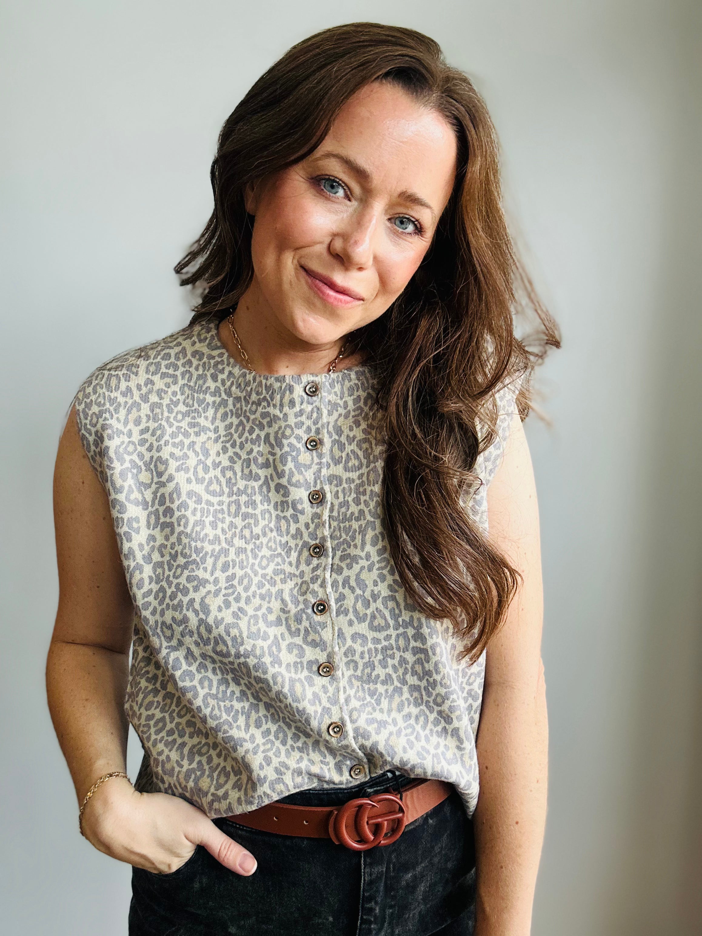 A classic neutral with a wild side! This sleeveless sweater vest features a soft, knit fabrication in a subtle leopard print that's easy to dress up or down. Finished with a full button-down front and ribbed hems for a polished, structured look. Style it solo on warm days or layer it under a jacket as the seasons shift.