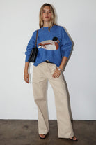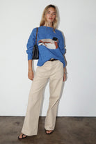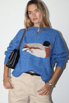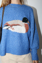 A playful, standout piece for your cold-weather wardrobe, this vintage-inspired duck graphic sweater brings charm, personality, and coziness all in one. Crafted from a soft, plush knit with a touch of wool for warmth, it features a relaxed silhouette, long sleeves, and a classic crew neckline. The bold blue base makes the hand-stitched–style duck motif pop, giving it that unique boutique feel your customers love.