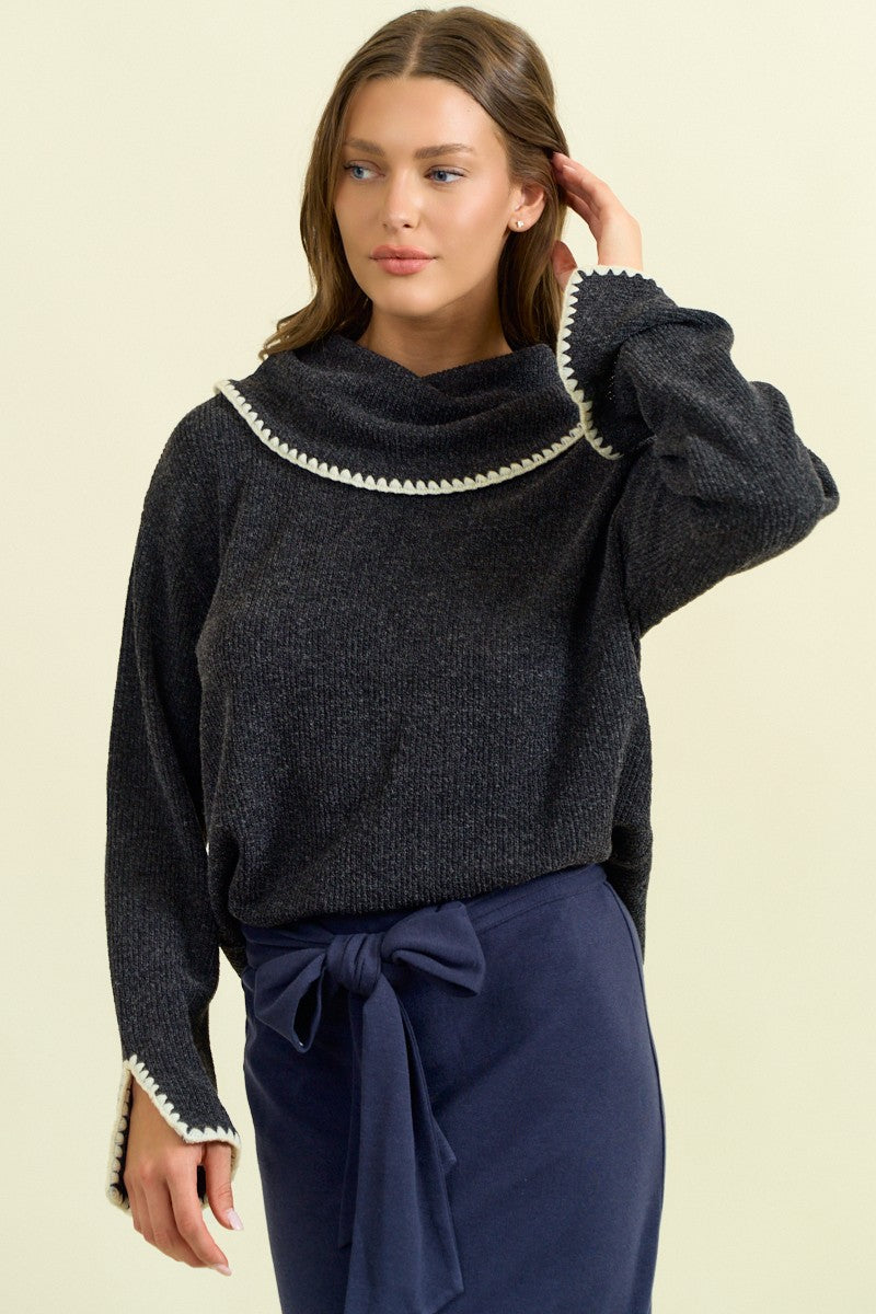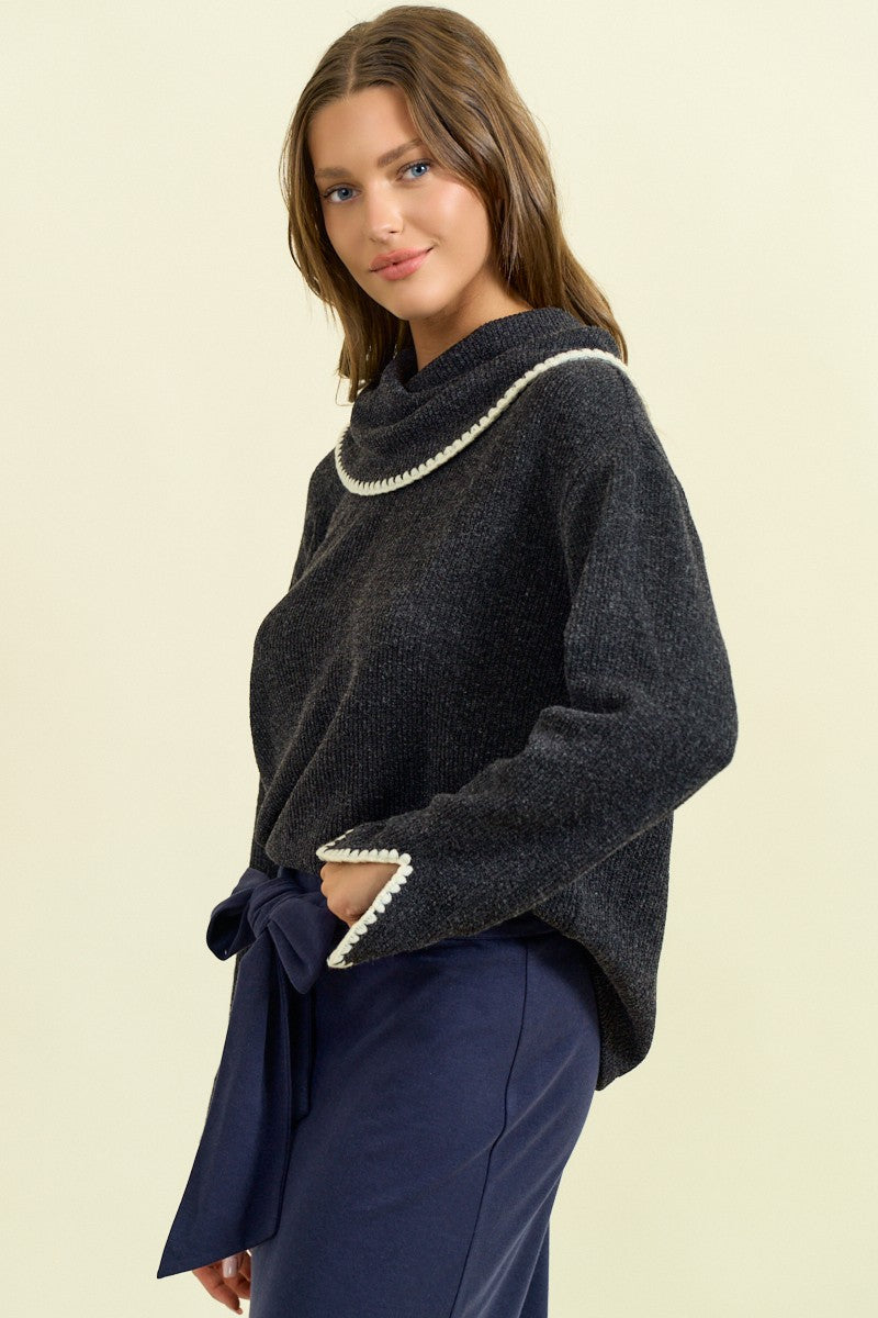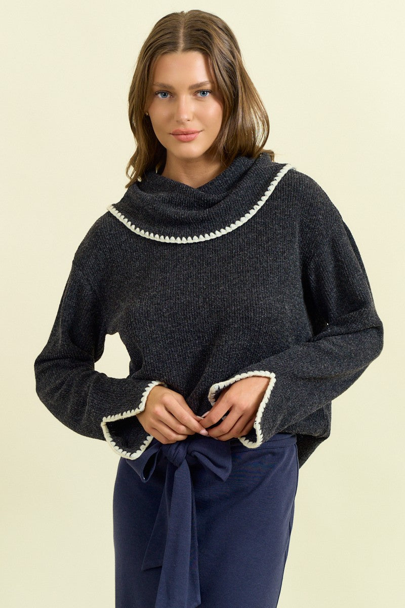 Cozy, elevated, and beautifully detailed—this bouclé ribbed top brings artisan charm to your everyday wardrobe. Designed with a relaxed cowl neckline highlighted by contrast blanket-stitch trim, it adds a soft statement without ever feeling overdone. The drop shoulders and easy silhouette create an effortlessly chic drape, while matching stitched cuffs offer a refined finishing touch.
