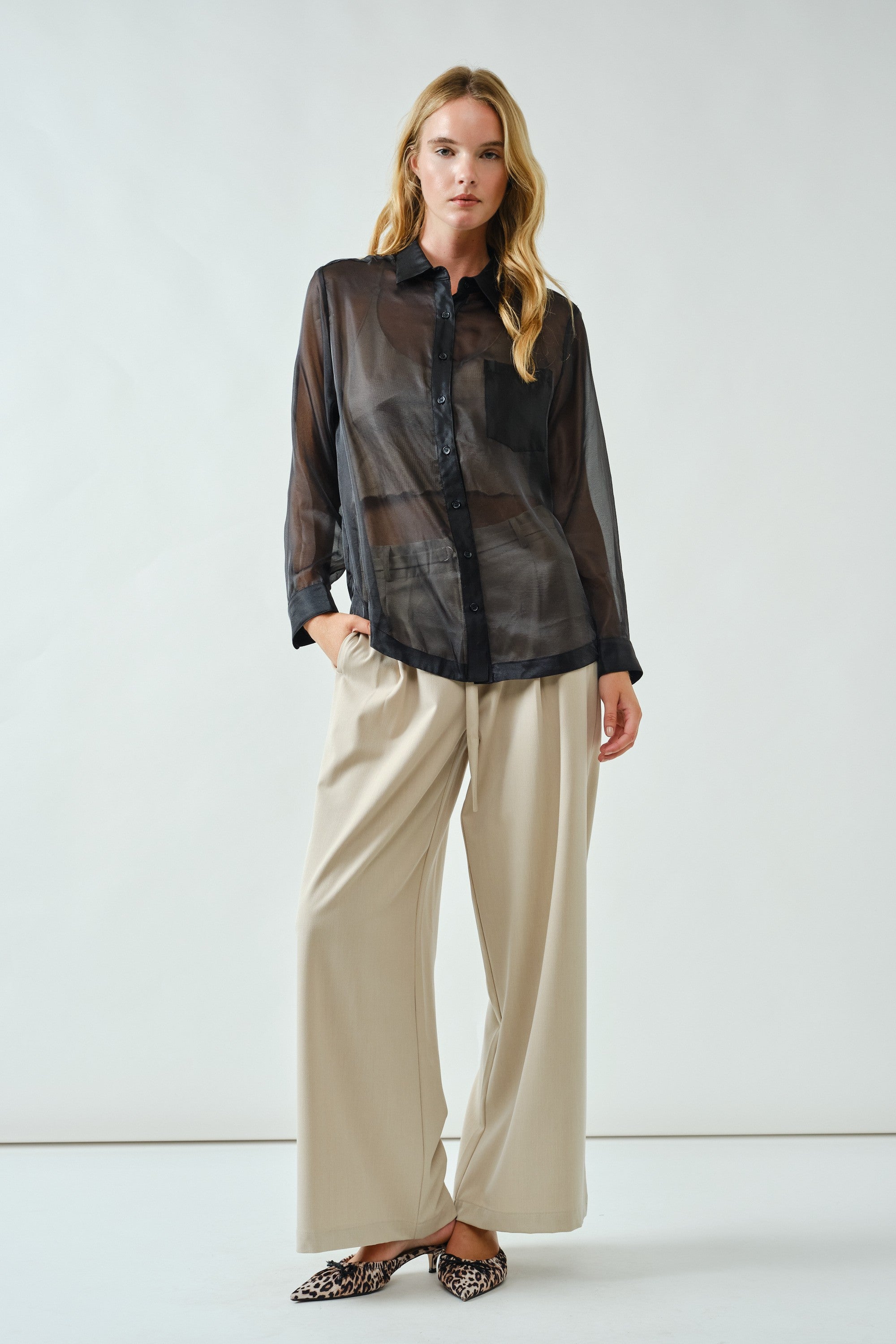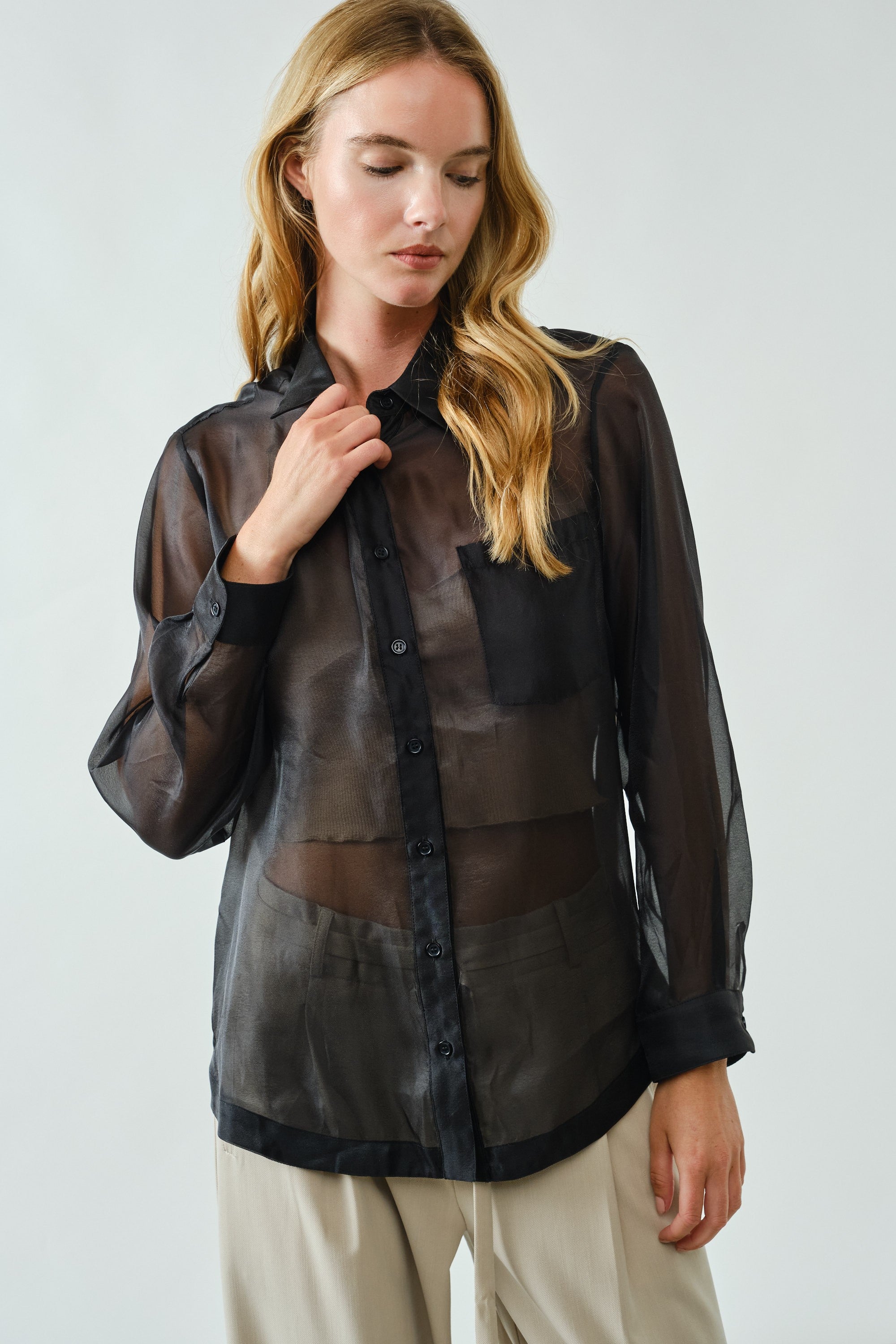Elevate your wardrobe with this stunning sheer organza shirt — a modern, fashion-forward layer that adds instant edge and elegance to any outfit. Designed in an effortlessly oversized silhouette, it drapes beautifully and pairs perfectly over camisoles, bralettes, or sleek tailored pieces. The classic pointed collar and button-down front keep the look refined, while the single chest pocket adds a subtle, polished detail.