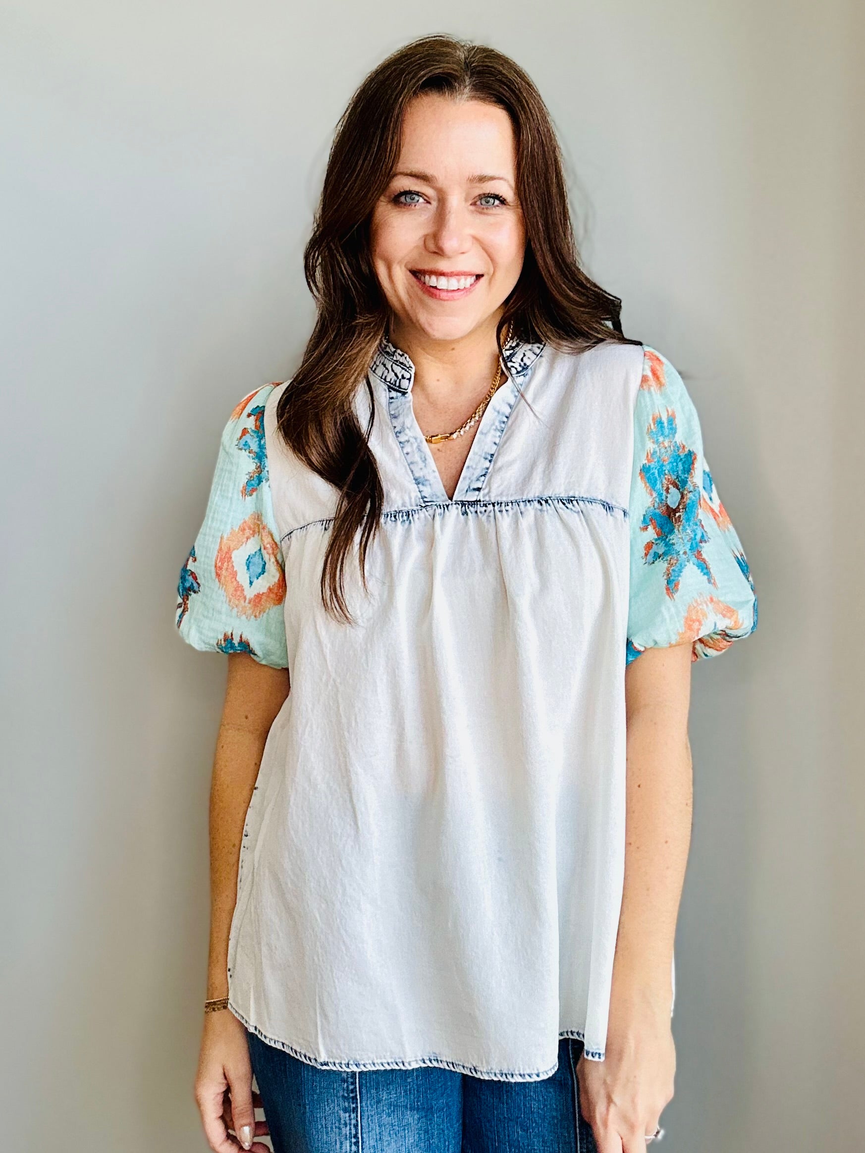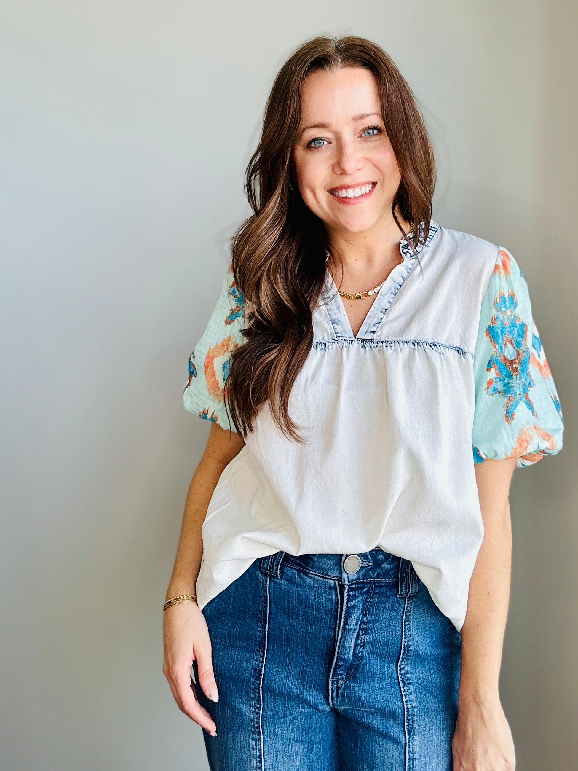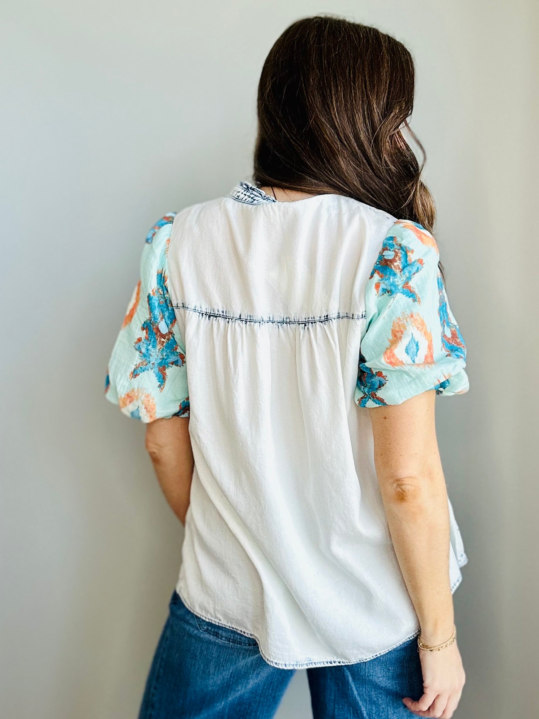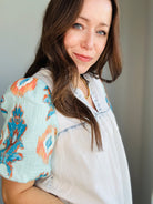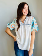 Add a splash of color and effortless charm to your wardrobe with our Boho Pop Embroidered Puff Sleeve Top. Featuring vibrant embroidered sleeves in a turquoise and coral palette, this airy blouse blends artisan detail with everyday ease. A soft cream body with denim-inspired stitch accents and a gentle V-neckline keeps the look grounded and versatile. Perfect for brunch, travel days, or creative workspaces—this top is a standout for spring and summer styling.