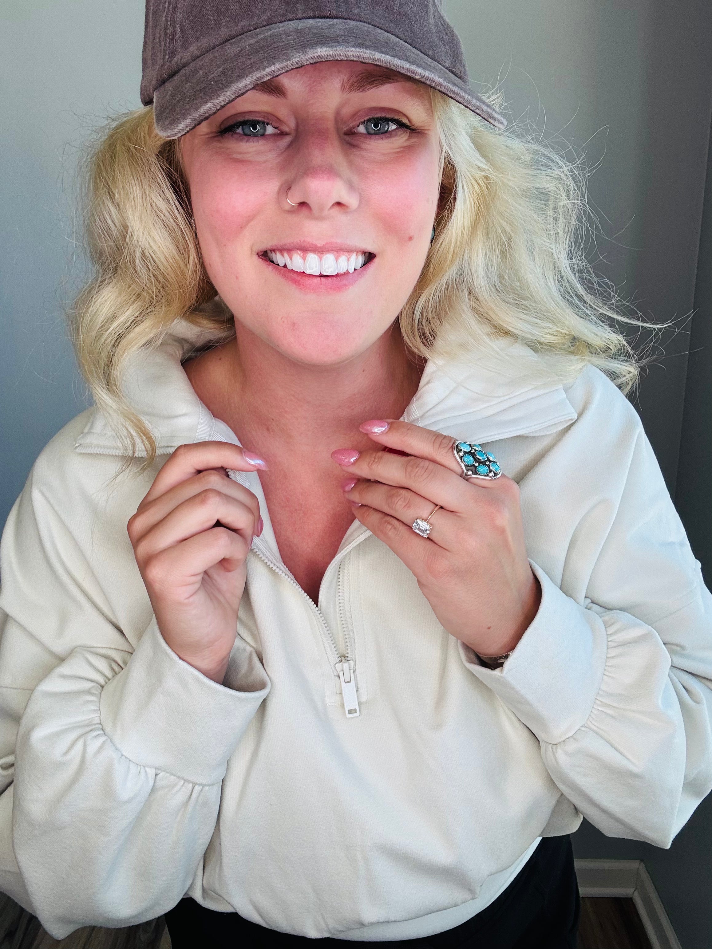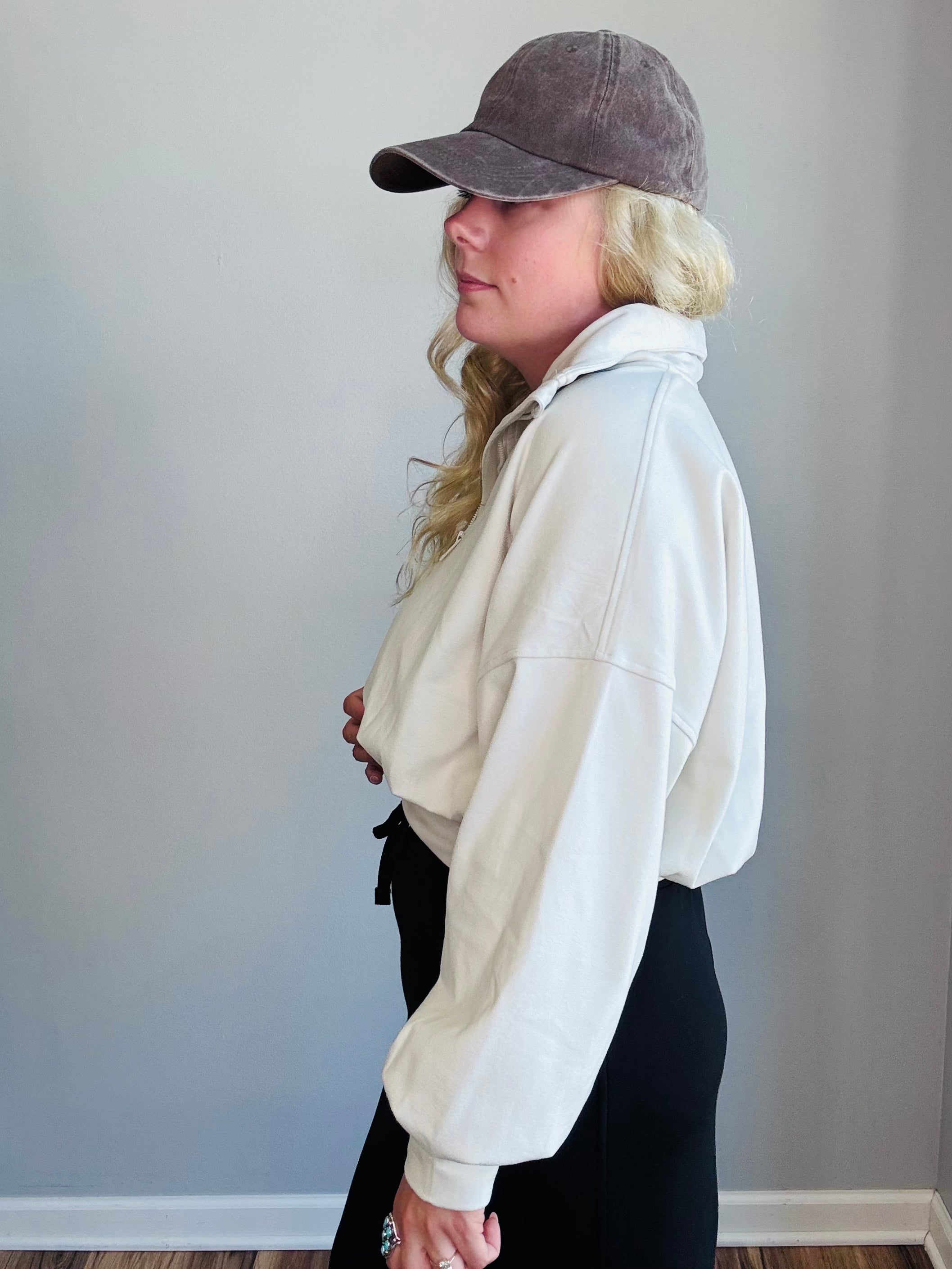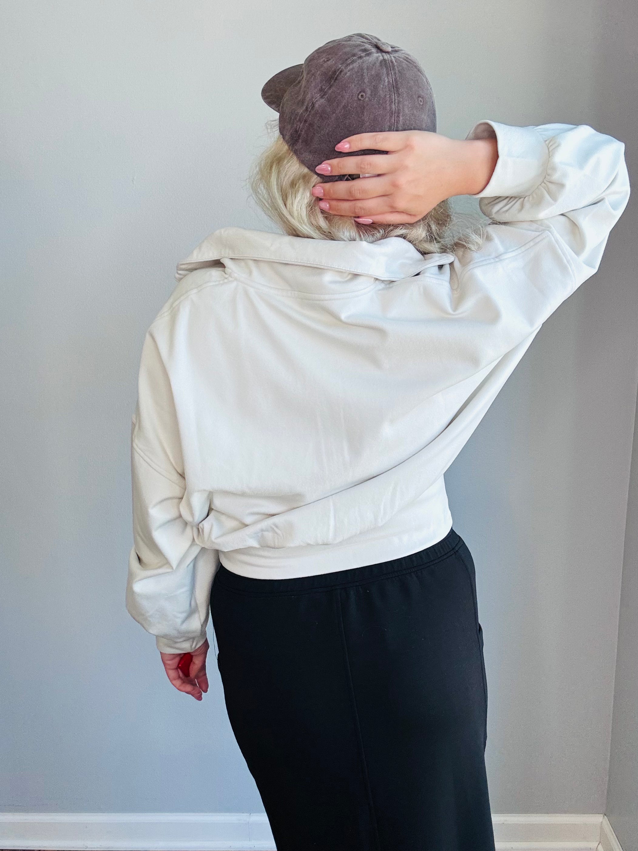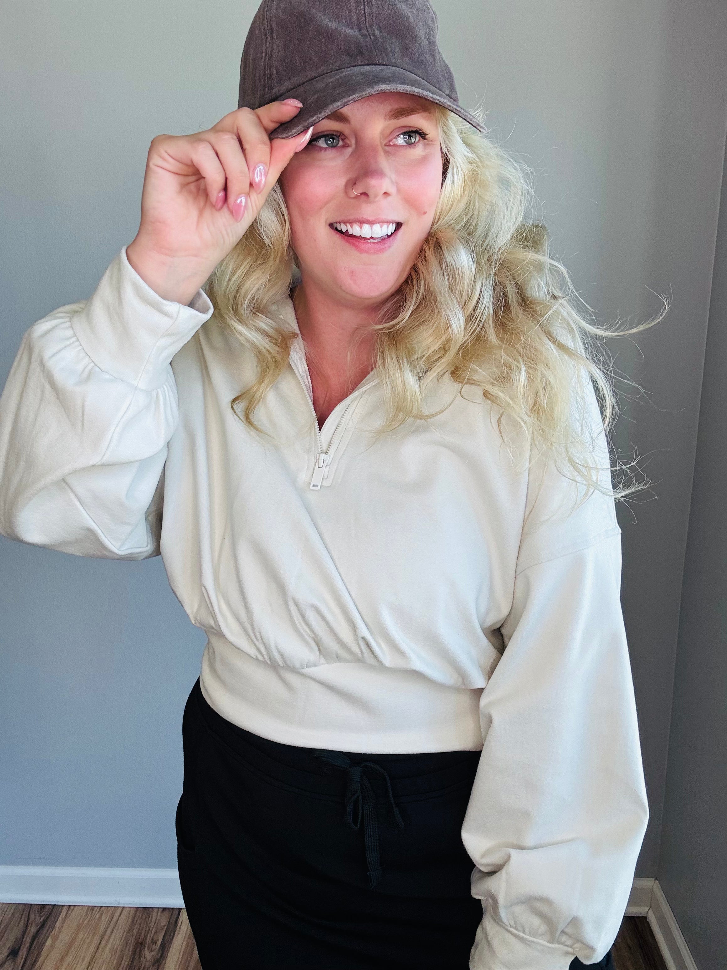 Stay warm and stylish with this ultra-soft brushed rib top, designed for both comfort and elevated off-duty vibes. Featuring a relaxed fit with a modern bubbled silhouette, this quarter-zip pullover is finished with a wide waistband and mock neck collar for an effortlessly chic look. The slightly cropped length makes it perfect for pairing with high-waisted leggings or joggers.