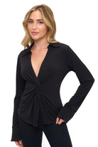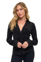 This top feels elevated yet effortless — perfect for date nights, dinner with friends, or adding a chic touch to your everyday wardrobe. The twist detail creates a gorgeous, shape-enhancing effect while the collared neckline keeps it refined.