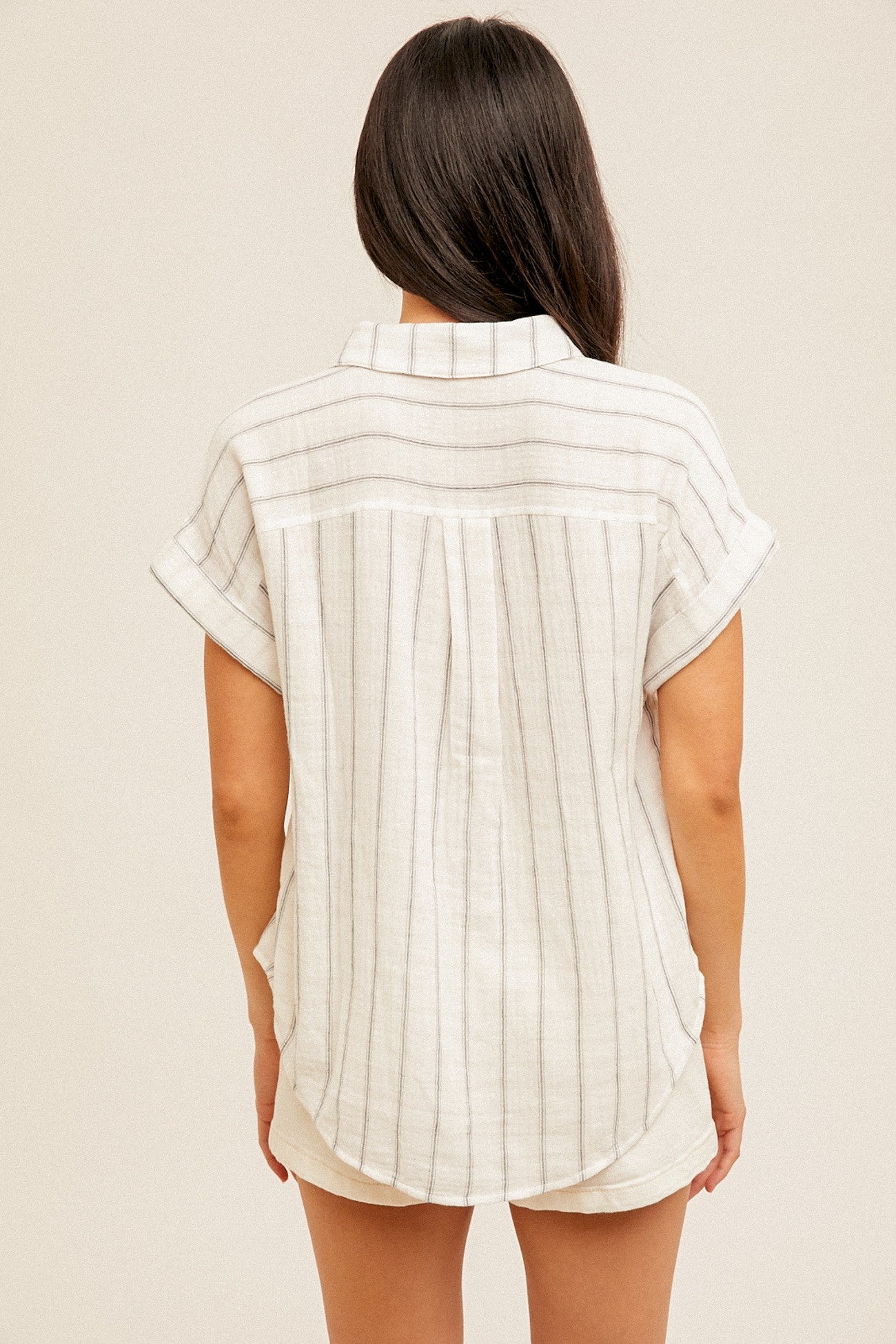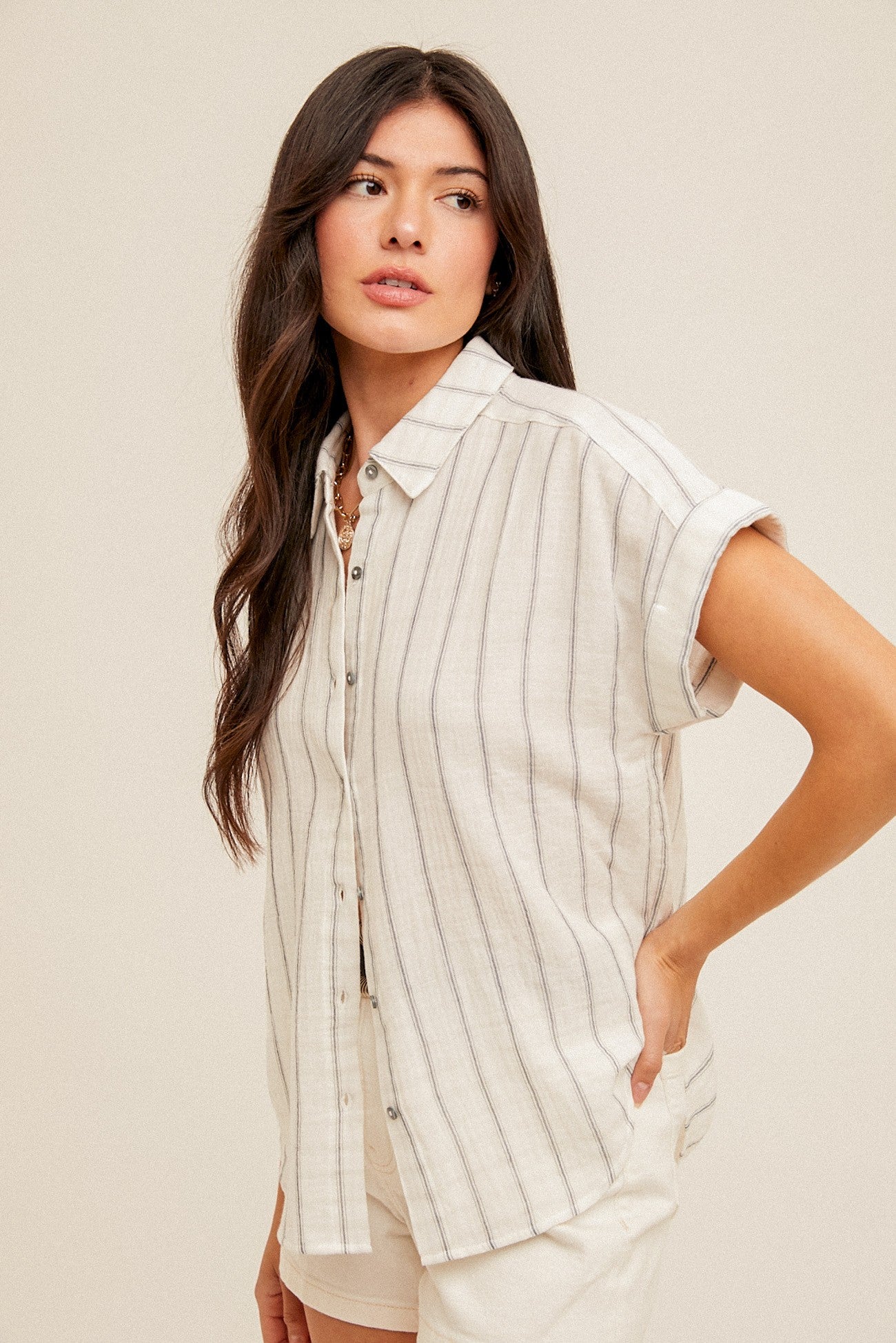 DOUBLE PLY STRIPE SHORT SLEEVE BUTTON DOWN SHIRT