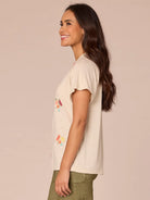 Take your boyfriend’s tee but make it feminine. This chic knit top features breezy short sleeves, a scoop neck, and cut embroidered fruit detailing for a casual yet cute vibe.