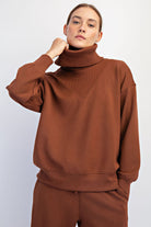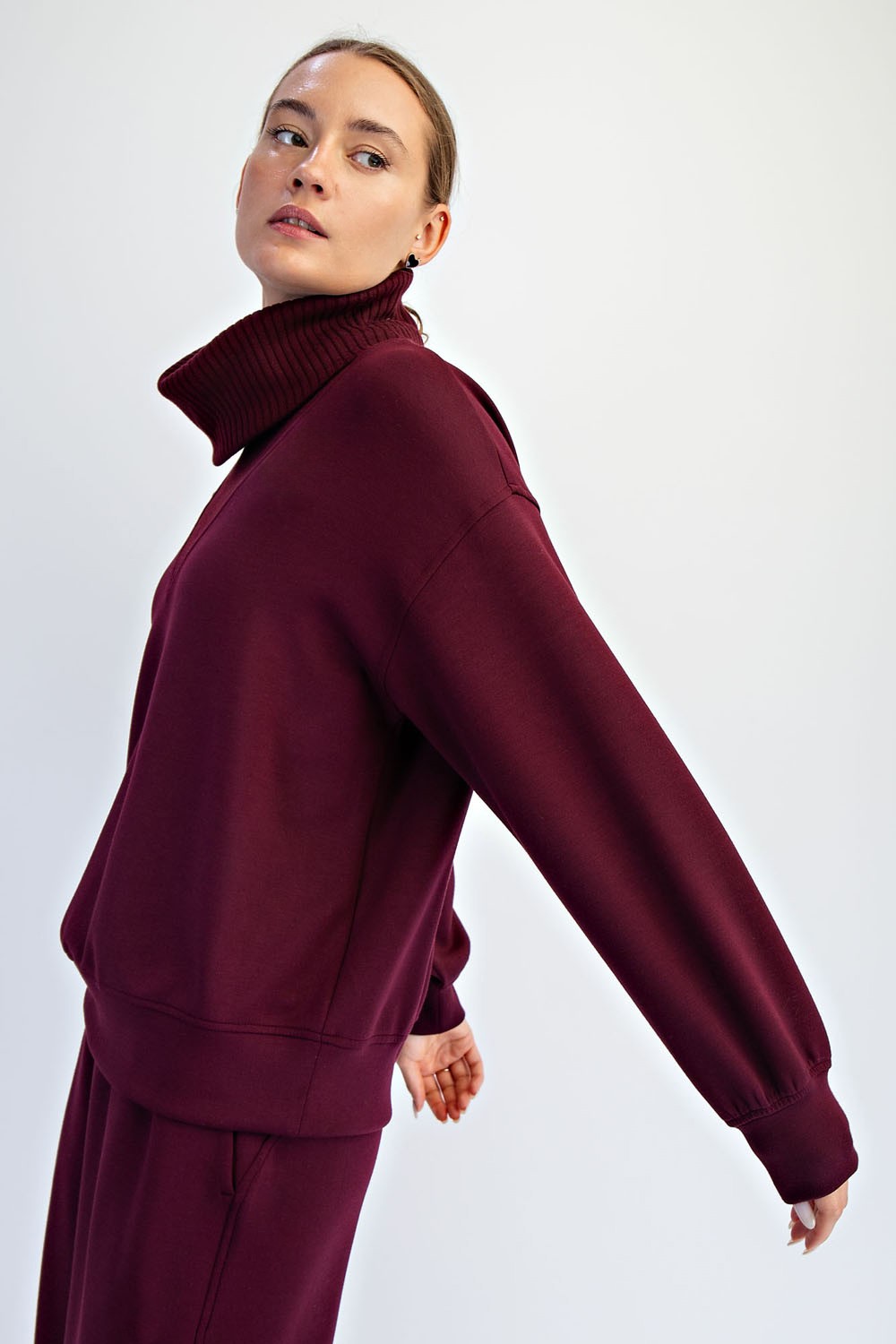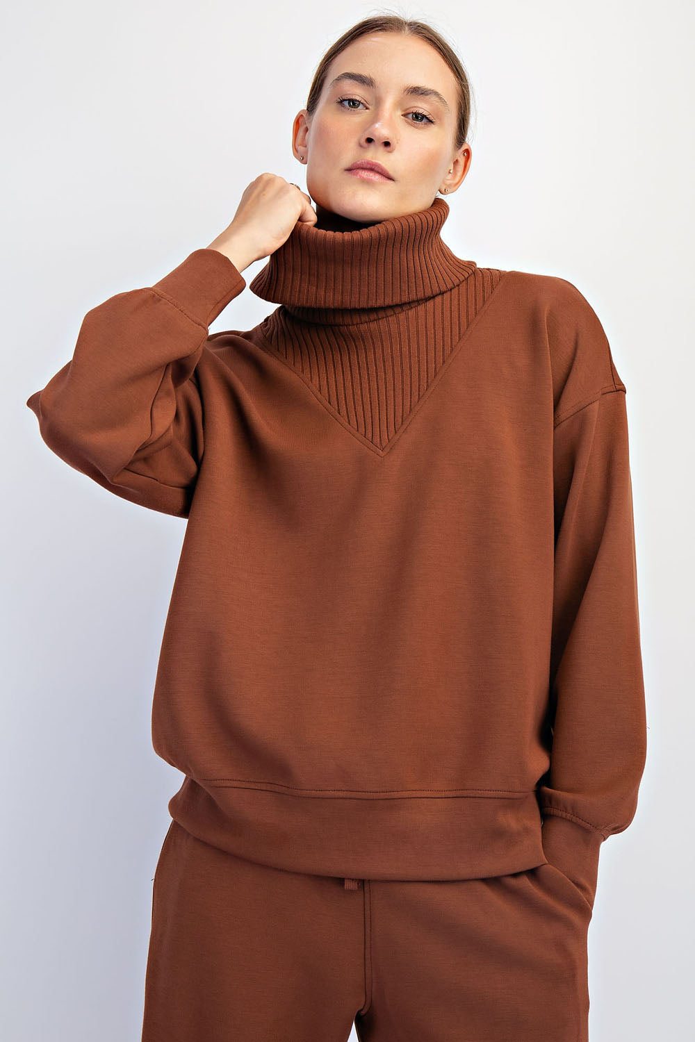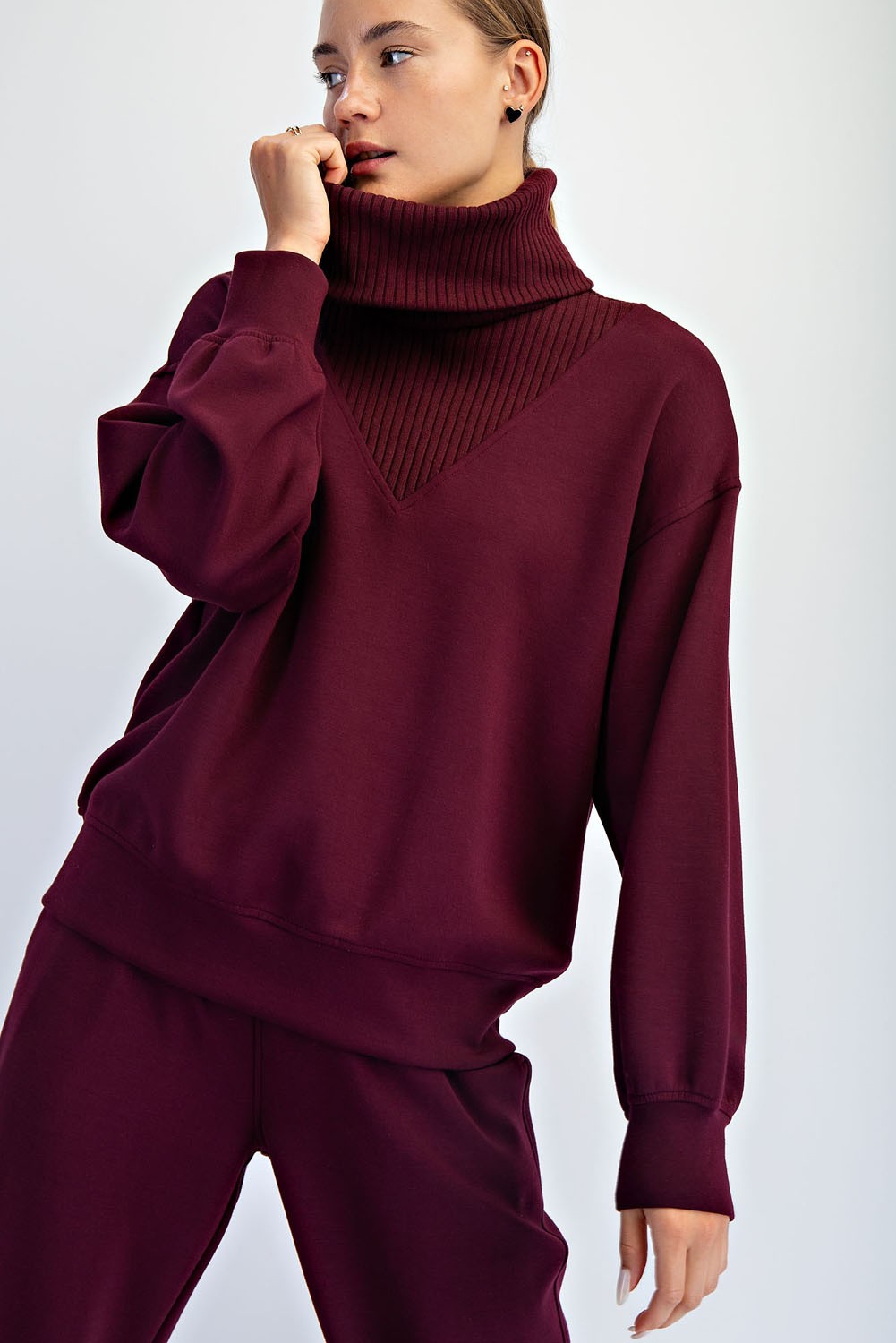 Meet your new elevated essential. Crafted from our signature modal scuba fabric, this chic top delivers the perfect balance of structure, softness, and modern design. The standout feature is the dramatic ribbed turtleneck that flows into a unique V-neck panel—adding dimension and a luxe, contemporary touch.