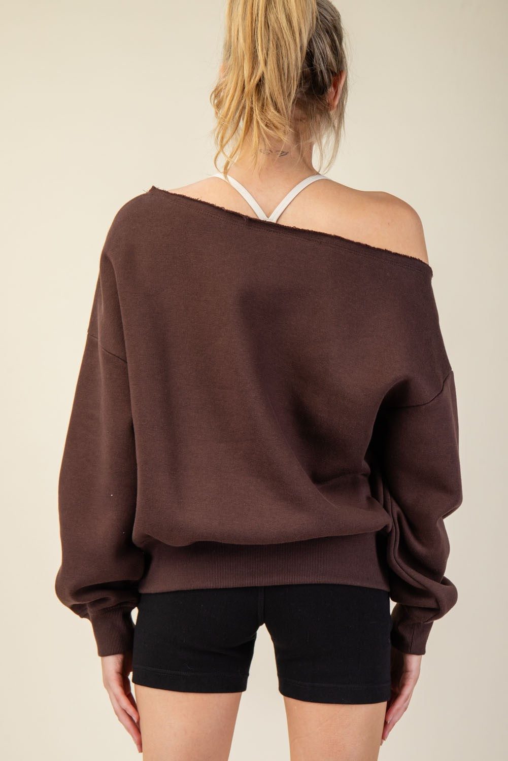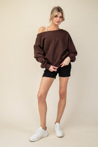 Slip into effortless comfort and style with this off-the-shoulder sweatshirt. Designed with a wide neckline for a chic, slouchy fit, it can be worn draped off one shoulder for an elevated, casual look. The soft fleece fabric ensures all-day coziness, while ribbed trim at the hem and cuffs gives it a polished finish. Perfect for lounging or pairing with denim and sneakers for weekend errands.