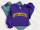 Bold collegiate-style "Optimistic" text in gold on a purple base