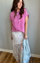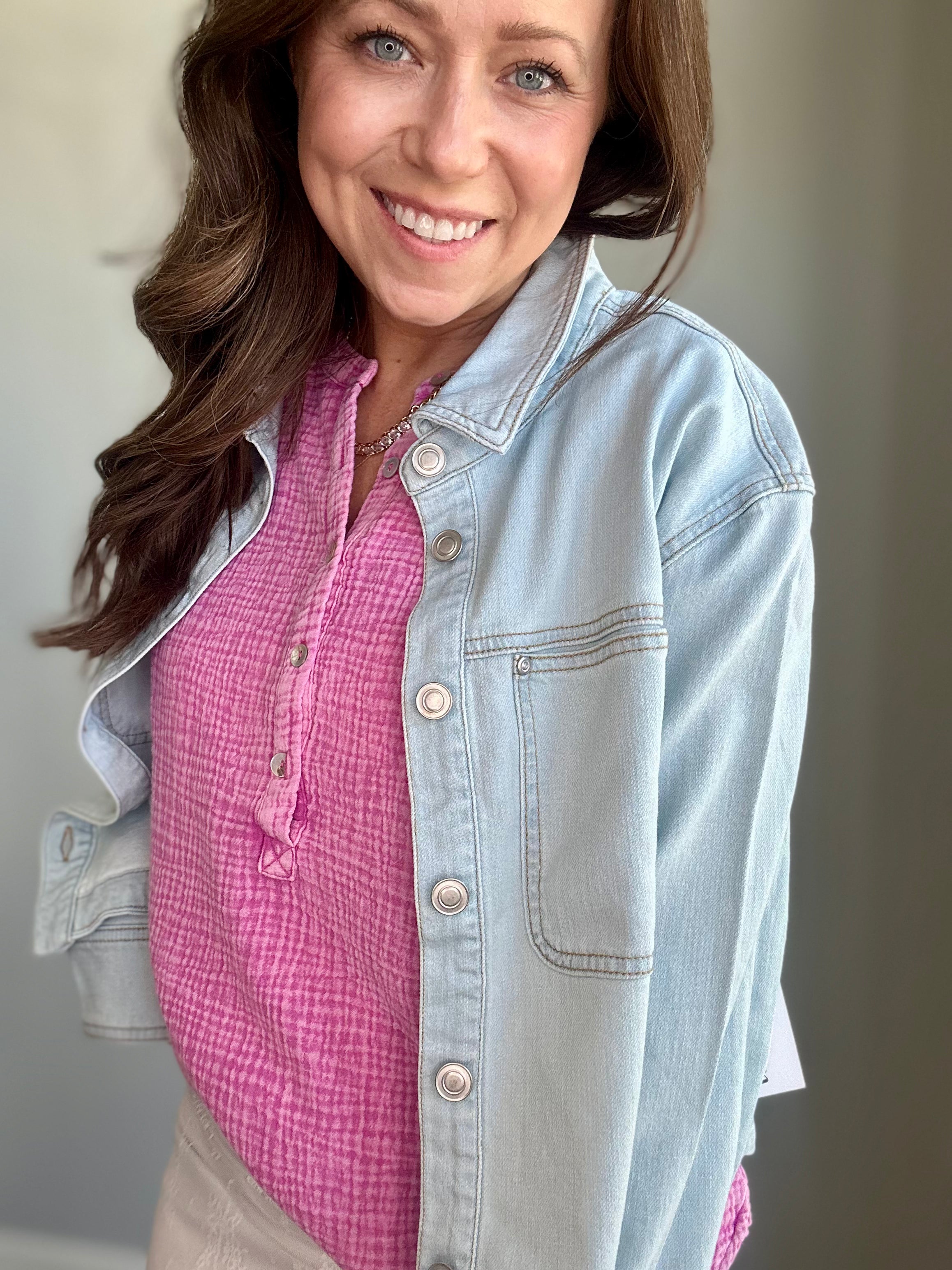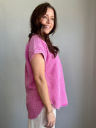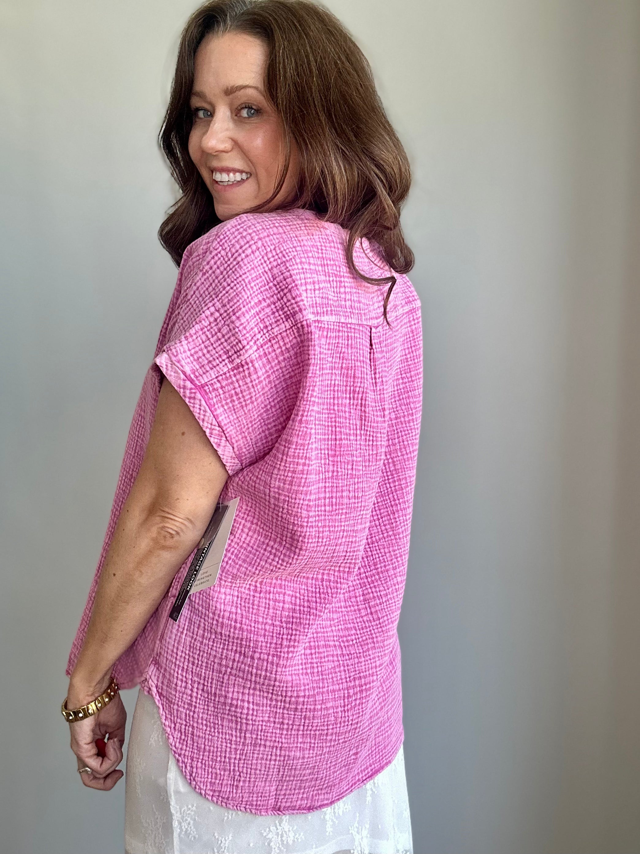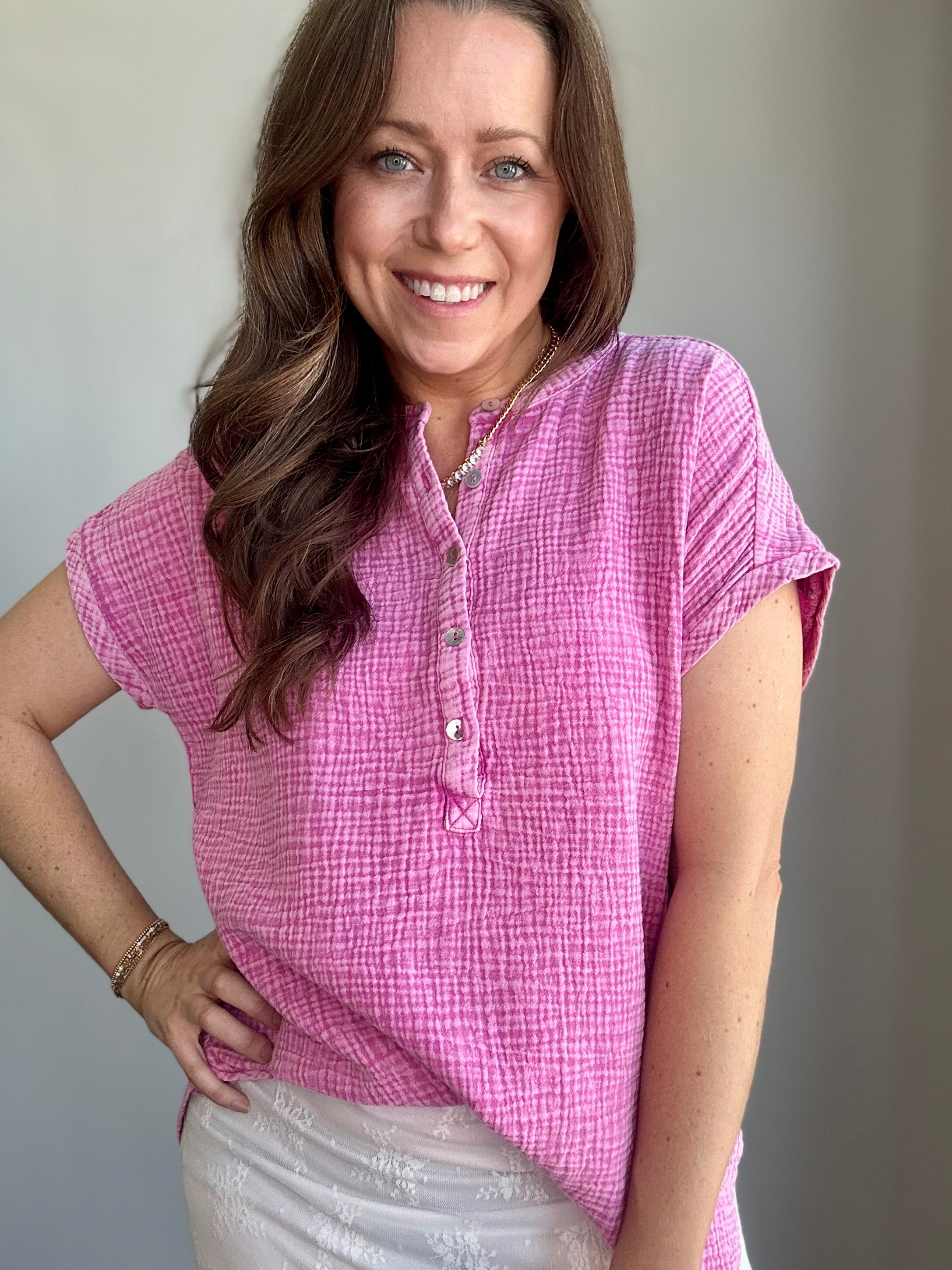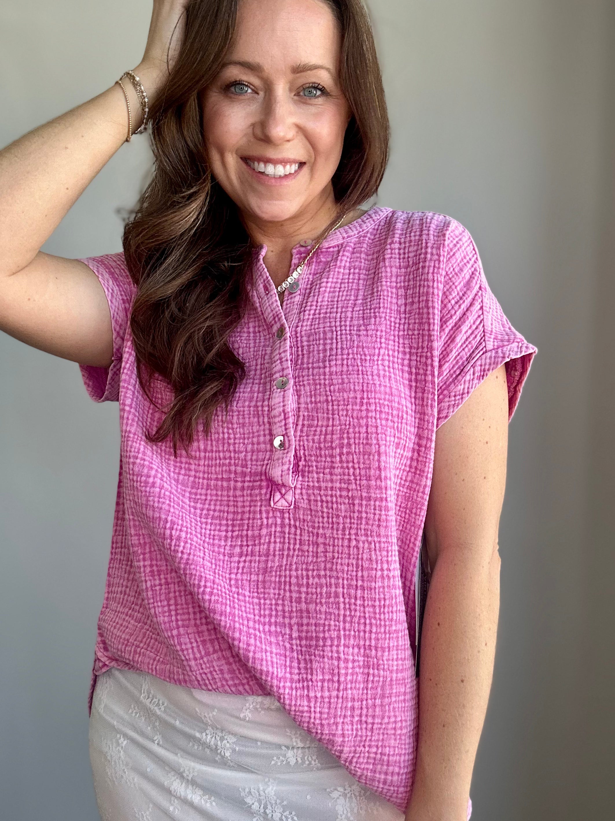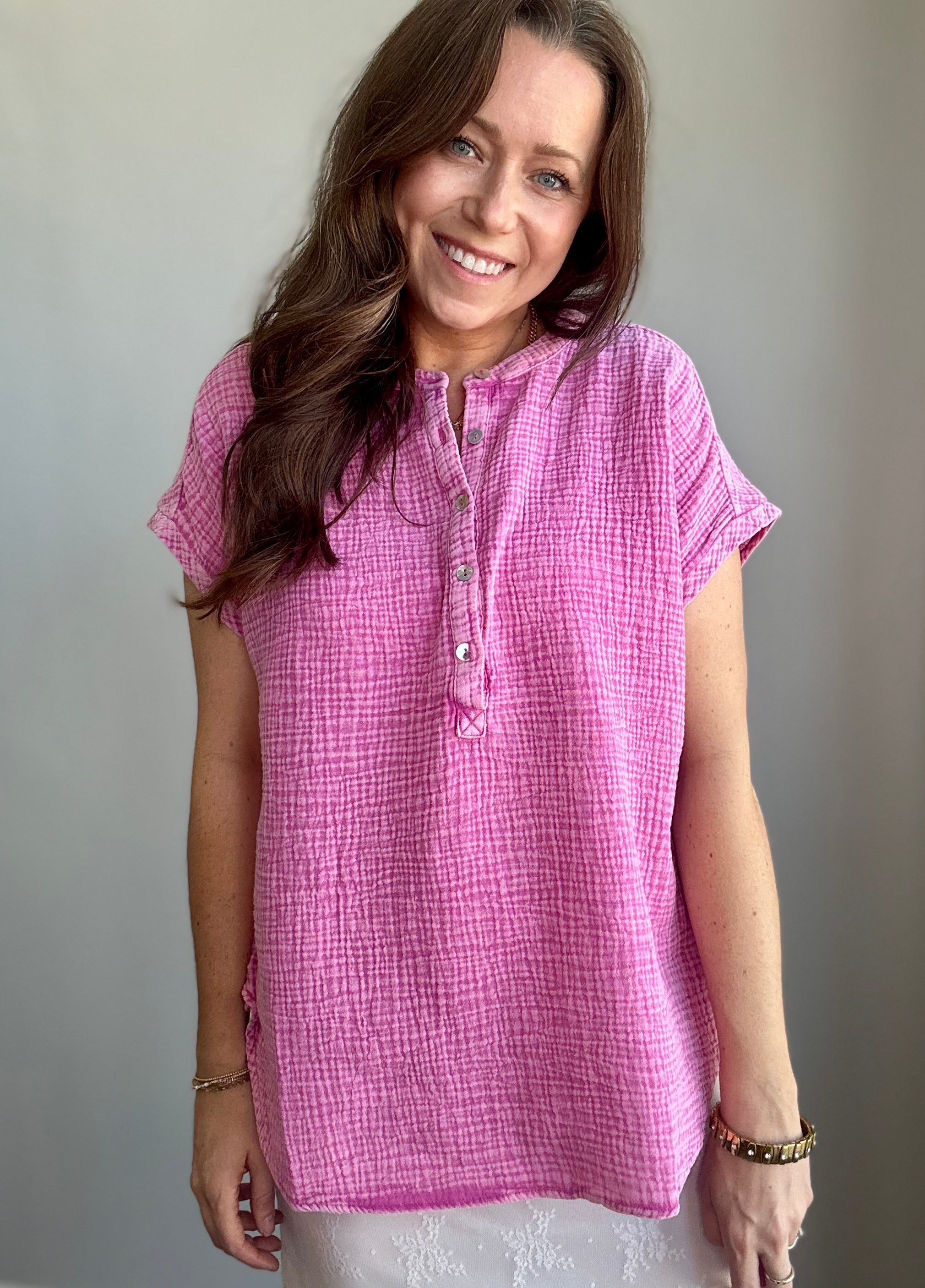 Add a cheerful pop of color to your everyday wardrobe with our Berry Pink Cotton Gauze Henley Top. Made from a breathable, lightweight double gauze fabric, this top brings effortless texture and comfort to your look. The relaxed silhouette features a rounded hem, short rolled sleeves, and a functional button-up henley neckline for easy styling. It's the perfect piece for warm days or layering under your favorite denim jacket.