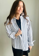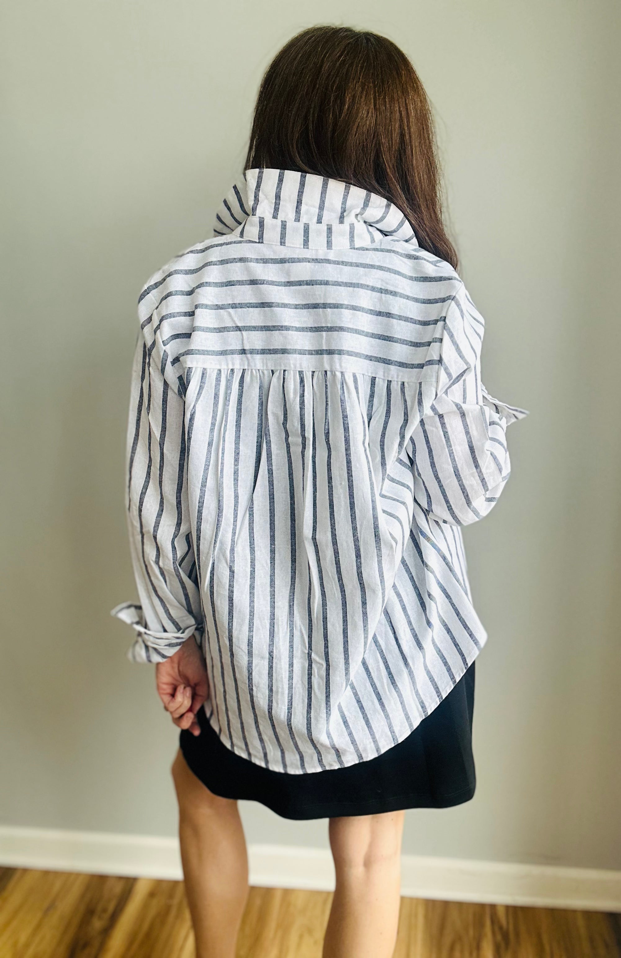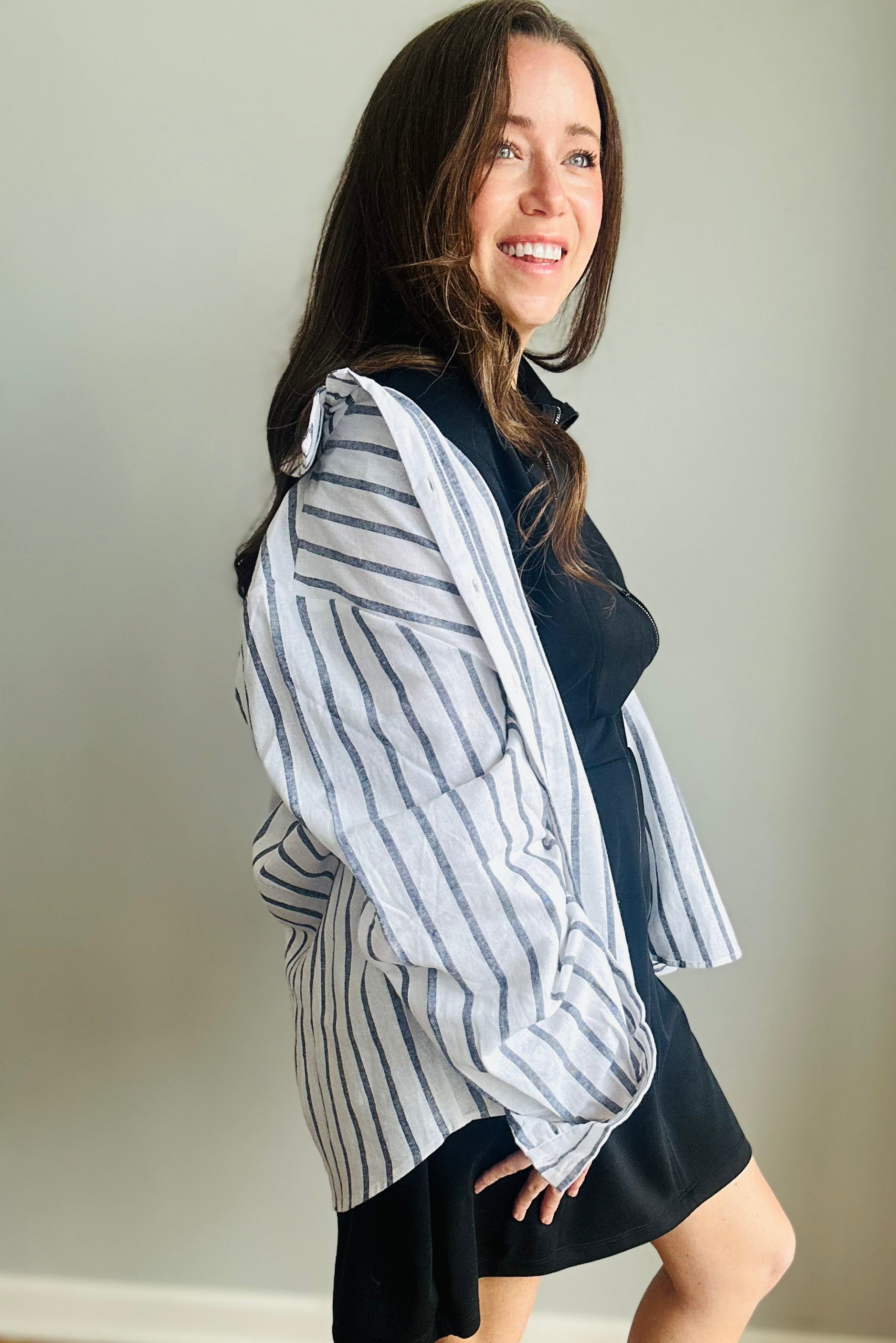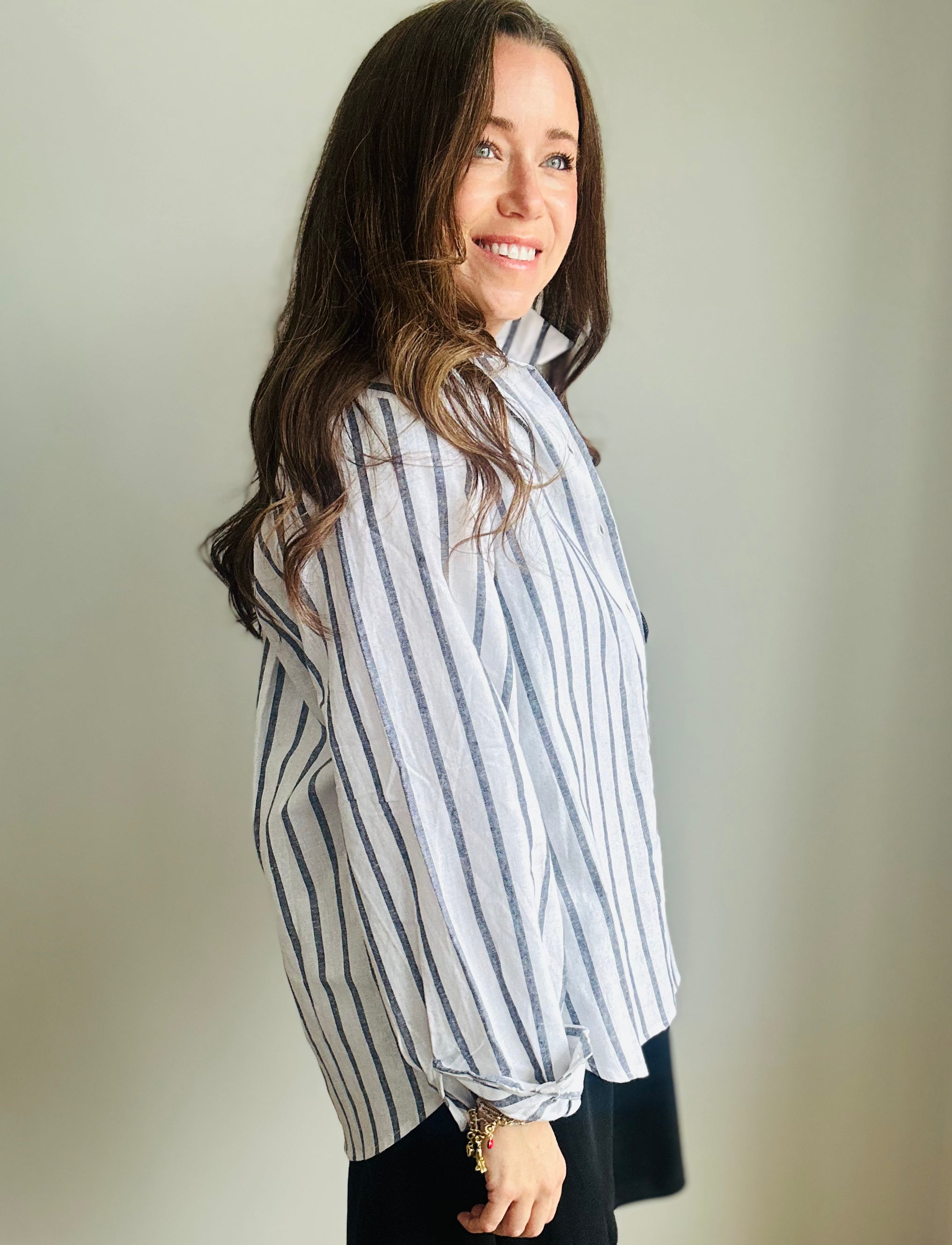 Breezy, classic, and endlessly versatile — our Coastal Striped Button-Up is a timeless wardrobe essential you’ll reach for all year round. With its relaxed fit and crisp blue-and-white vertical stripes, this shirt brings an effortless coastal vibe to your everyday style.