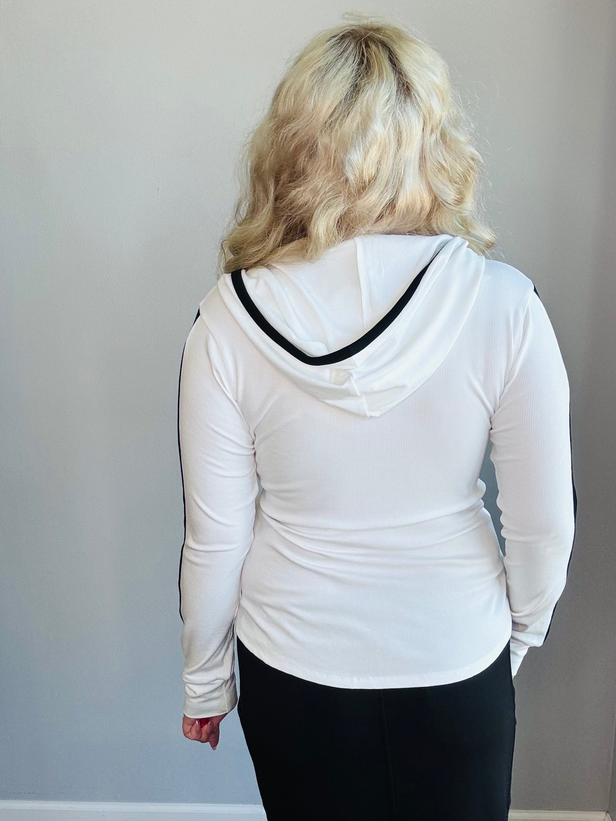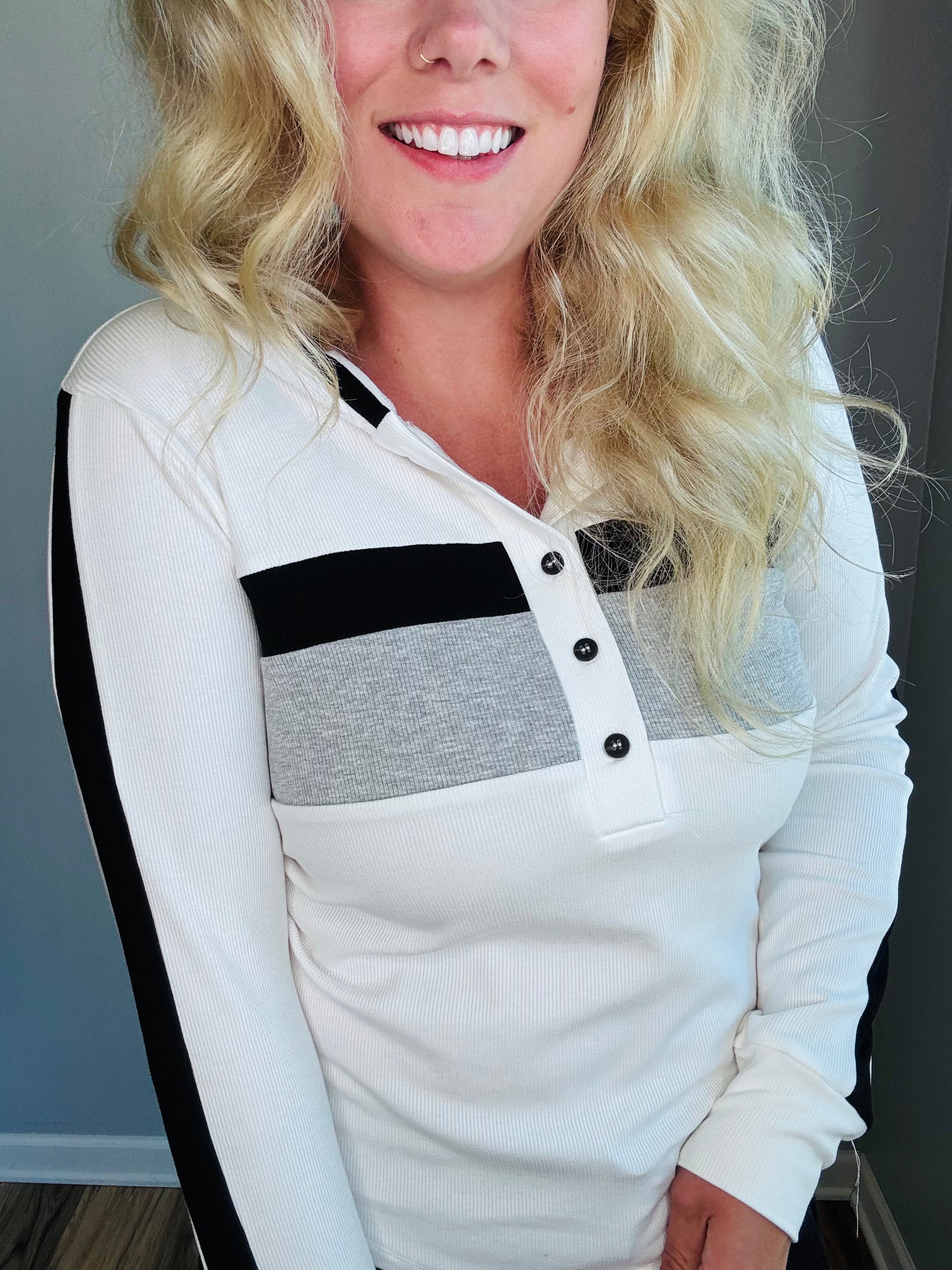 Sporty meets effortlessly chic in The Game Day Henley Hoodie. This lightweight knit pullover features a modern colorblock design in crisp white, soft heather grey, and bold black accents. With snap-button detailing at the neckline and a relaxed hood in back, it blends comfort and style seamlessly. The contrast stripe down each sleeve gives it a vintage athletic vibe—perfect for casual weekends, coffee runs, or cheering on your team in style.