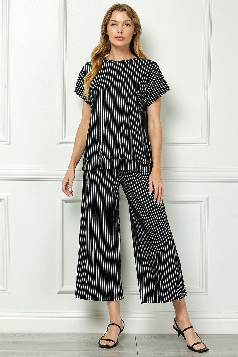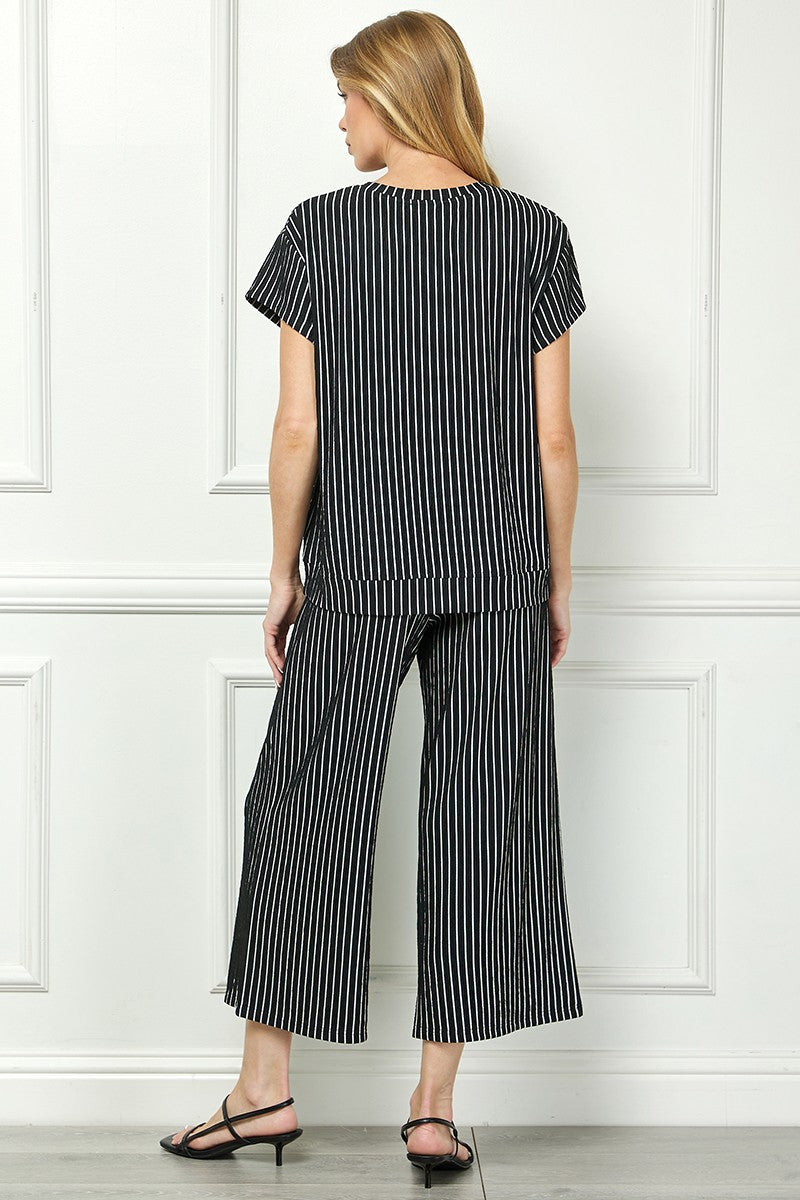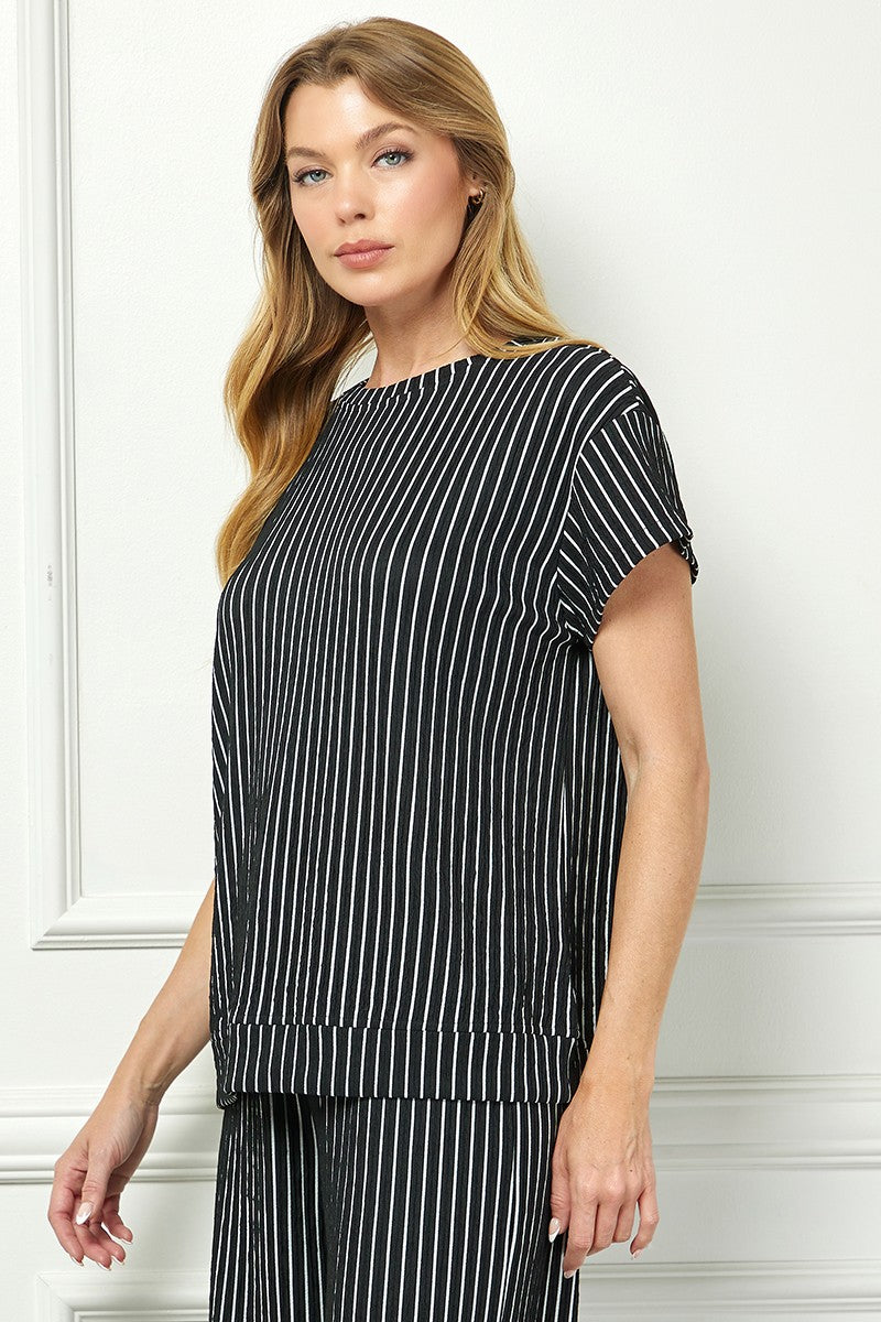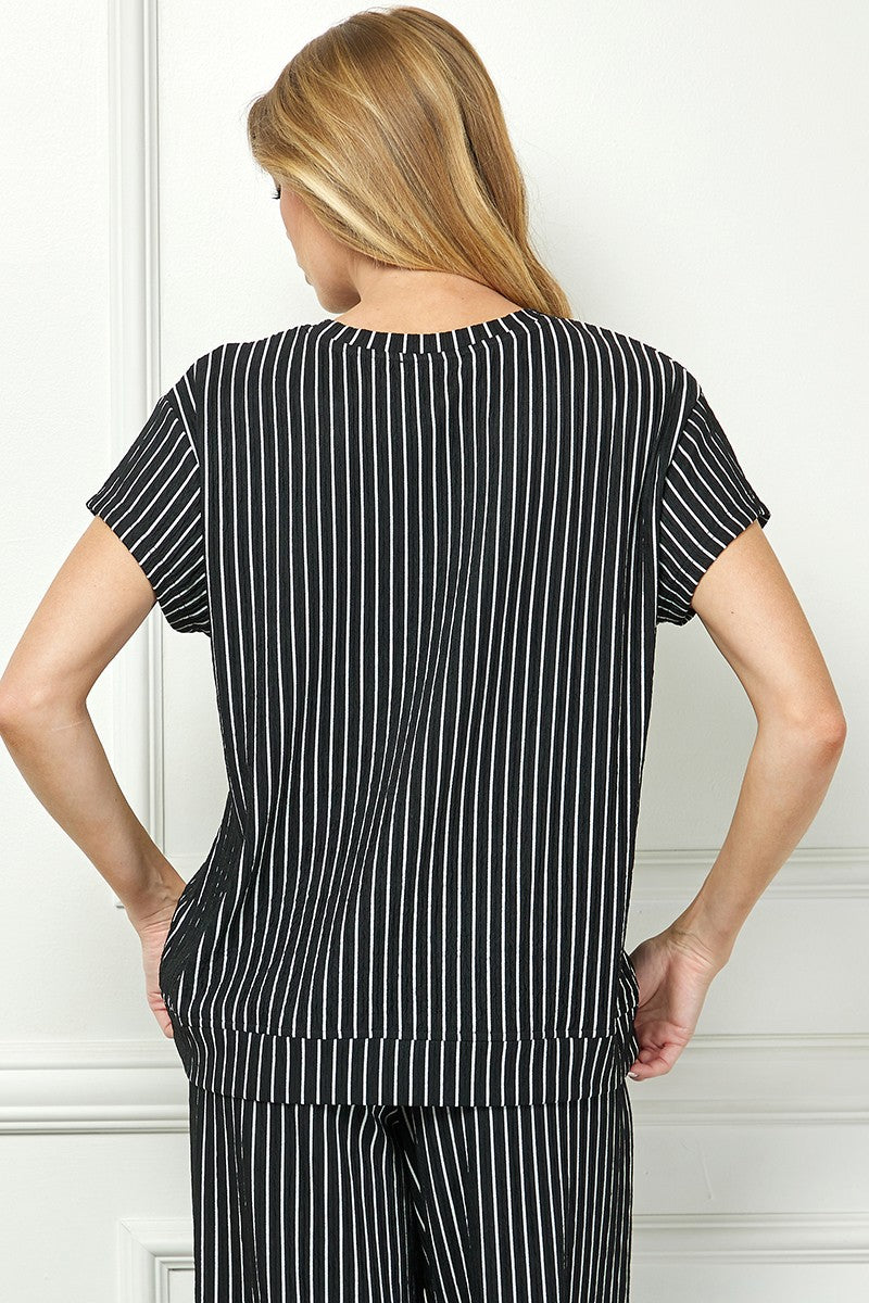 Effortless and versatile, this black top with vertical white stripes is a wardrobe essential that works for both casual days and polished nights. Designed with a relaxed fit, short sleeves, and a classic crew neckline, it drapes beautifully whether worn loose, half-tucked, or fully tucked. The matching striped pants create a chic set, but this piece also pairs perfectly with denim, trousers, or skirts for endless styling possibilities.