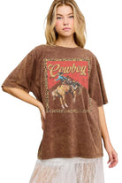 Add a touch of western flair to your everyday style with the Western Vintage Cowboy Graphic Tee. This mineral-washed cotton tee features a bold vintage-inspired cowboy print framed in subtle leopard detail for the perfect mix of rustic charm and modern edge. Its soft, lived-in feel and relaxed boyfriend fit make it your go-to for casual days, concerts, or weekend adventures.